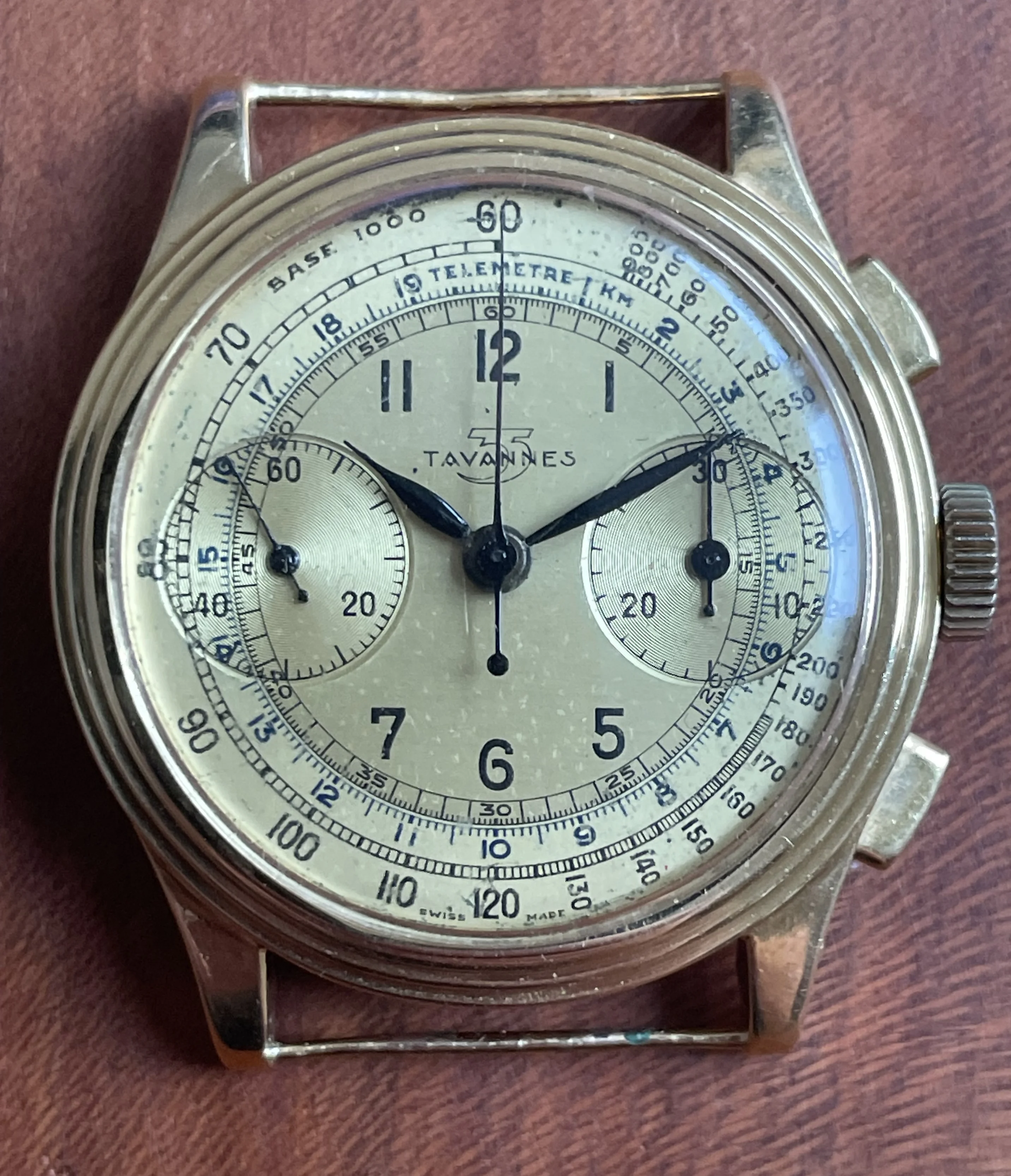 A Tavannes chronograph with the same dial but a different case sold for 2650$ last year: https://www.liveauctioneers.com/ite...nes-chronograph-wristwatch-in-18k-yellow-gold