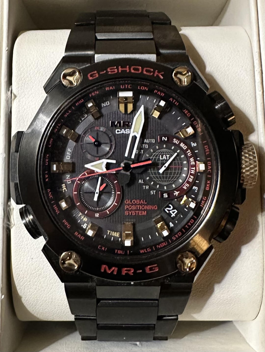 Selling my pristine condition MRG Akazaone GPS. Full box, instruction booklet, and all the links (currently sized to a 7.25 wrist). $1450 - CONUS Only - No trades at this time - Insured shipping included - PP, Zelle or Venmo - PP G/S add 4.5% - can do F2F in Chicago area Date Stamp: [https://imgur.com/a/LyGWbWm](https://imgur.com/a/LyGWbWm) The **G-Shock MR-G MRGG1000B-1A4** is a premium timepiece in the MR-G series, known for its robust build, advanced features, and sophisticated aesthetics. Here are the key specs: * **Series:** MR-G (Flagship G-Shock Series) * **Model:** MRGG1000B-1A4 * **Case/Bezel Material:** Titanium (DLC Coated for scratch resistance) * **Band:** Titanium * **Glass:** Sapphire Crystal with non-reflective coating * **Water Resistance:** 200M (20 ATM) * **Dimensions:** 54.7 × 49.8 × 16.9 mm * **Weight:** 153g # Key Features * **Tough Solar:** Solar-powered with a power-saving function. * **GPS Hybrid Wave Ceptor:** Auto time correction using GPS signals and Multi-Band 6 radio signal reception. * **Triple G Resist:** Resistant to shock, centrifugal force, and heavy vibration. * **World Time:** 27 time zones, auto summer time (DST) switching, home city/world time swapping. * **LED Illumination:** Super Illuminator (LED light) for low-light visibility. * **Daily Alarms:** 1 daily alarm. * **Stopwatch:** 1-second measuring unit, measuring capacity up to 23:59'59". * **Countdown Timer:** 24-hour countdown range. # Aesthetics * **Color Scheme:** Black DLC-coated titanium with red accents. * **Design Details:** Traditional Japanese armor motif; black and red combination inspired by samurai warrior aesthetics.