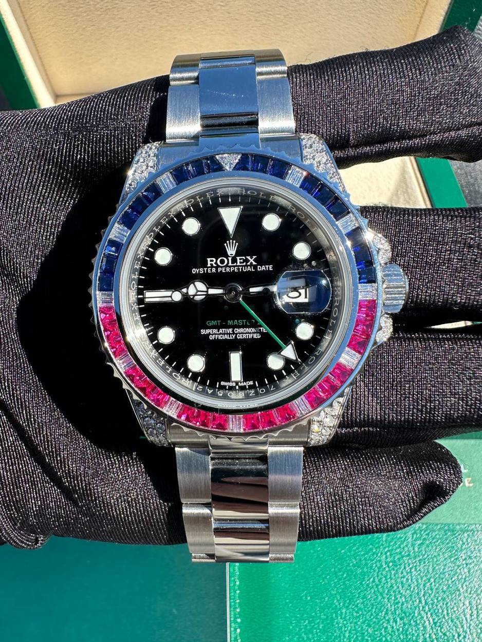FSOT: Rolex GMT Master 40mm II 116710 diamonds rubies sapphires set stainless steel