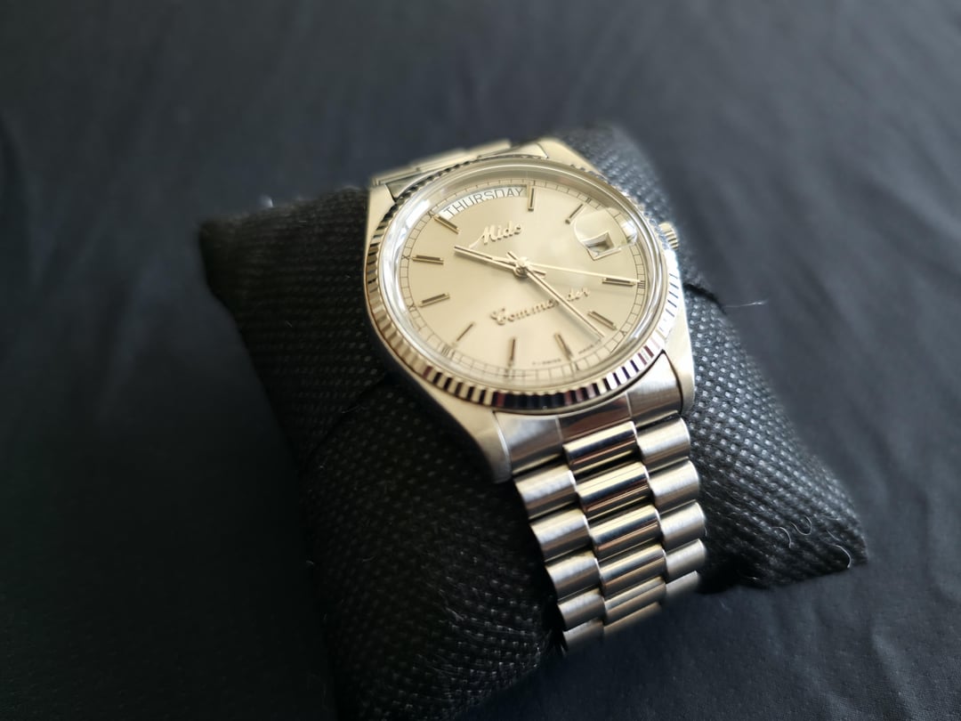$650 (Shipping to CONUS included!) Selling my **Mido Commander 8299 DayDate President** — a classic look ready for a new home! This watch is in great condition, keeps time perfectly, and looks absolutely stunning. With a design inspired on the Rolex Day-Date President, but with its own charm. The perfect crystal (featuring a date magnifier), clean dial, slight patina on the hands, and great condition make this a solid addition to any collection. All functions are working flawlessly — Screw down crown, day-date wheel, and timekeeping. Watch only. I’m happy to answer any questions or provide additional photos and videos for peace of mind! **The details:** **Motive of sale:** The watch has not seen a lot of wrist time lately, and unfortunately, I make the frequent mistake of trying out new (and expensive) hobbies, so I figured it would be better to part ways with it. **Movement:** Automatic ETA 2834-2 **Case:** 36mm; Stainless steel monocoque **Lug-To-Lug**: 41mm **Lug Width:** 20mm