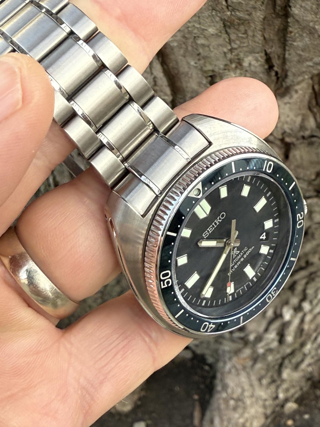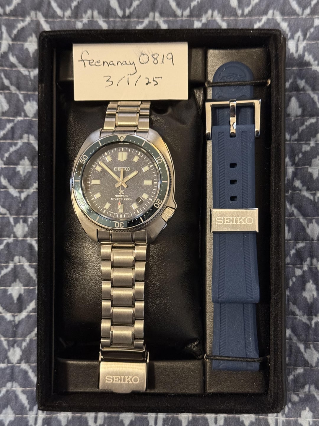 **Seiko SLA049 – “Uemura”** outstanding condition (*except rubber strap – see below*) - 2nd owner, purchased from Chrono24 from private seller Timestamp & additional photos: [https://imgur.com/a/lt3RdhV](https://imgur.com/a/lt3RdhV) ***This one is something special.*** I hate like hell to part with this magnificent piece, but I've decided to retire and am only keeping three watches (OK, maybe four....we'll see): Omega Aqua Terra 2503.50 (my wedding watch), Monta Skyquest V2, and Marathon Arctic Navigator. * Blue textured dial (stunning!) / Lumibrite hands/indices and bezel (12:00 pip) / date at 4:30 * 316L stainless steel case (super-hard coating) / unidirectional steel dive bezel / curved sapphire crystal * Diameter: 44.0mm / lug-to-lug: 49.3mm / thickness: 13.0mm / lug width: 20mm * Movement: **Seiko Caliber 8L35** – automatic 50-hour power reserve - essentially an undecorated version of Grand Seiko automatic movement caliber - 28,800 beat smooth sweep * Screw-down crown / 200m water resistance * Limited edition #20 out of 1,200 * Seiko OEM stainless steel bracelet (super-hard coating) / Seiko blue rubber strap (*note: my crazy cat chewed a bit of the strap end....really the only discernible cosmetic defect in the whole kit*) * Entire kit includes watch with bracelet and rubber strap, tags, presentation box, manual, and extra fat boy spring bars. * Bracelet has been sized to 7.25" wrist, but includes extra links. * [https://www.seikowatches.com/us-en/products/prospex/special/1970reinterpretation](https://www.seikowatches.com/us-en/products/prospex/special/1970reinterpretation) I'm asking **$1900** with payment by PayPal F&F. Shipping included by USPS Priority Mail (insured) from St. Louis. ***I'm not looking for trades, thanks.***