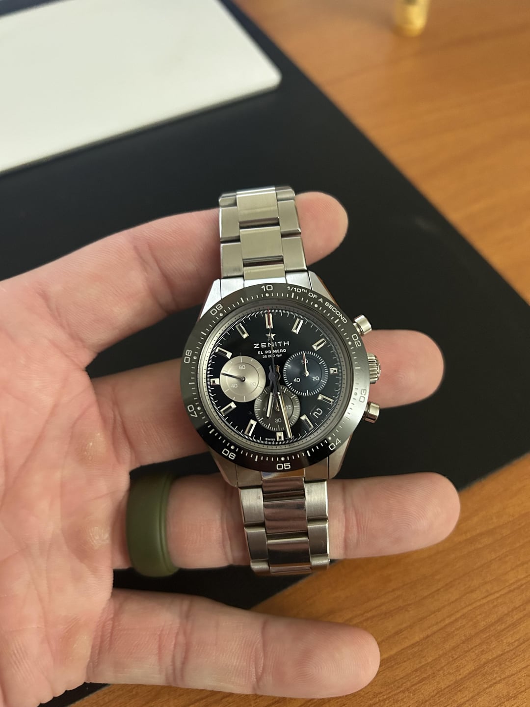 Hi there WatchEx Fam! I'm back after a long hiatus! For sale today is my beautiful Zenith Chronomaster Sport! I purchased this piece off watchEx in 2023 in May and I have worn it well. Daily use is reflected in the watch case as well as the price :) . This is not just a "Daytona Killer". It has it's own merit with the wonder El Primero 3600 movement which beats at 36000 Vph. It is keeping time at around -7 seconds a day, but the amplitude is strong but of course, YMMV. The only reason I am moving on from this piece is because I am making space for another piece that I am expecting in a few months! Im listing this piece at $4750 OBO! I prefer PP (G&S to be paid by buyer) and I ship CONUS. If any questions, please let me know!