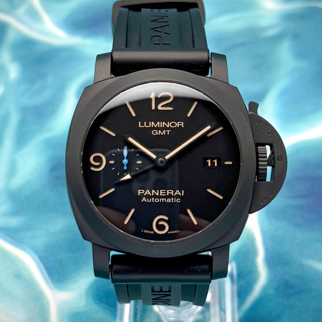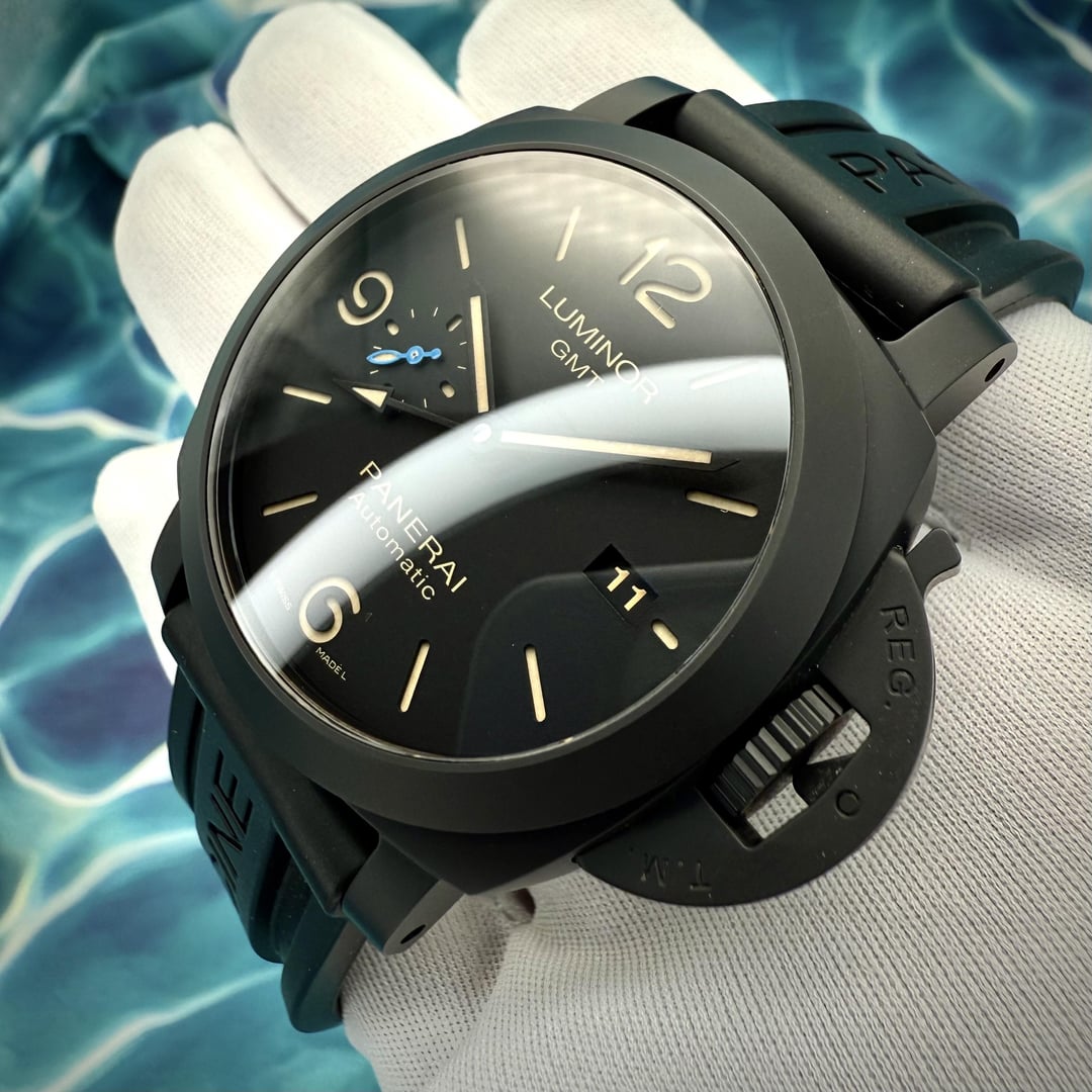 Up for sale is this 2021 Panerai Luminor GMT Automatic with the 44mm Ceramic Case. This watch has an MSRP of $12,100, so it's priced to move. CONDITION: Watch is in excellent condition with very little to no signs of wear. There is a barely (only noticeable with magnifying glass) smudge on the bezel at 6 o'clock and 9 o'clock. The rubber strap has some signs or normal wear and the leather strap is in excellent condition. **PRICE: $7,198** \+ label SHIPPING: We ship fully insured Priority overnight within the Continental US. PAYMENT: We accept Zelle or bank wire as payment. I'm happy to provide plenty of strong references as well as to hop on a video chat to introduce myself, my company, the watch, and make sure that this timepiece is the right one for you. COMES WITH: \- Watch \- Inner box \- Outer box \- Panerai instruction manual \- Panerai International Warranty Card \- Leather strap \- Panerai tool Timepieces are an incredible accoutrement to our lifestyles, so I strive to accurately display all of my watches' exact condition in my photos/videos and pride myself in being very customer service oriented. My goal is to have 100% positive and smooth transactions, so please feel free to reach out if you have any questions, and thanks so much for checking out my listing!