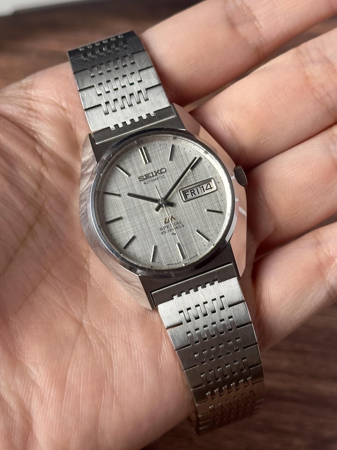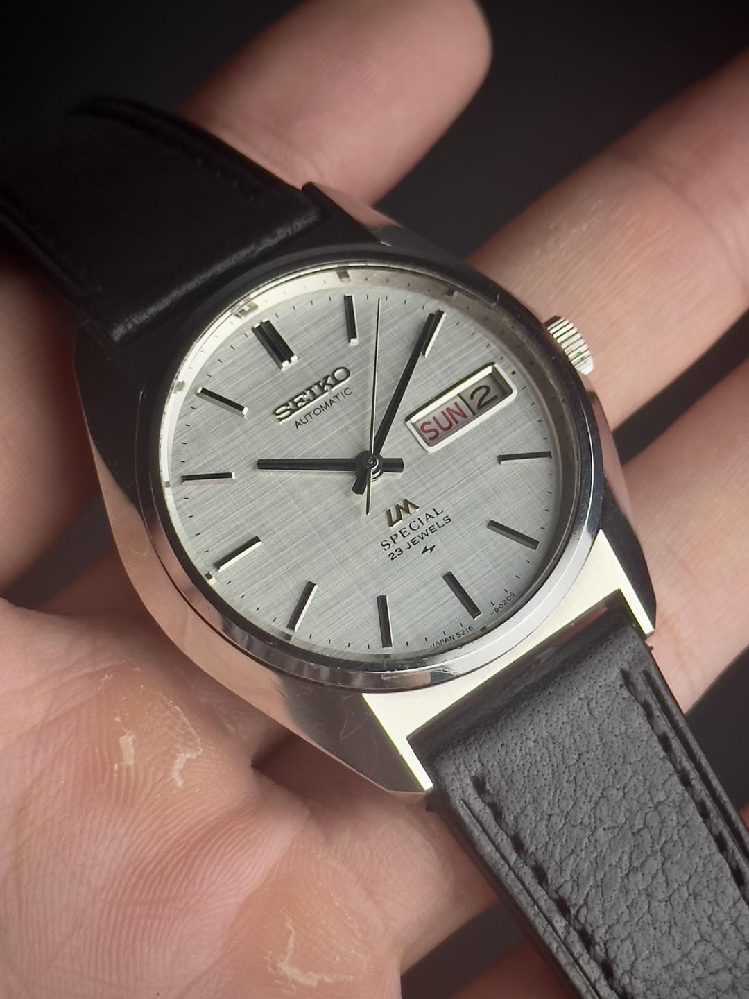 Up for sale is a Seiko LM Special 5216-8020 Grey Linen Dial in excellent condition Images: https://imgur.com/a/jjkFGvi Video: https://imgur.com/a/BZSvky7 Timestamp: https://imgur.com/a/UMekZHR Produced for just a year (1975-76), the Seiko 5216-8020 is one of the most sought-after Lord Matic Special models. It features a sharp case reminiscent of the vintage Grand Seiko 61GS, with curved sidelines, high-polished surfaces, and a distinctive linen dial in grey with gold accents on the “LM” logo. The “Special” designation isn’t just for show—Seiko used it to mark higher-regulated movements. Powered by the high-end 5216 automatic calibre from the Daini factory, this movement was part of Seiko’s last push to outdo their Suwa counterparts. Though Daini is long gone, its innovations live on in modern Credor and Alpinist models. The watch is in excellent condition with only minor scratches. The crystal is clear and the dial is clean showing no aging for its age. The watch diameter is 37mm, thickness of 10mm and lug width of 19mm. The movement is recently serviced, keeping excellent time. The watch comes with original bracelet that fits up to 8 inches wrist though I have swapped a custom vachetta leather strap for showcase you can see the condition of the bracelet in the slides. Watch doesn’t come with original box, standard Seiko box will be provided upon purchasing. Price: $4̶9̶9̶ now is $450 + $35 flat shipping (via FeDex/DHL). (Express shipping costs me $60-80) Payment via PayPal F&F or G&S (+4.6% fee paid by the buyer). Not accepting trades. Feel free to message me with any questions or if you’re interested. Have a great day! Check out my other watches on Instagram: @jasonswatchcorner