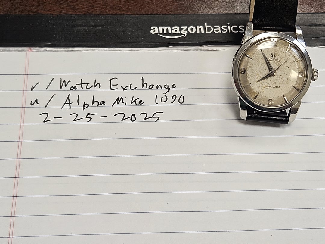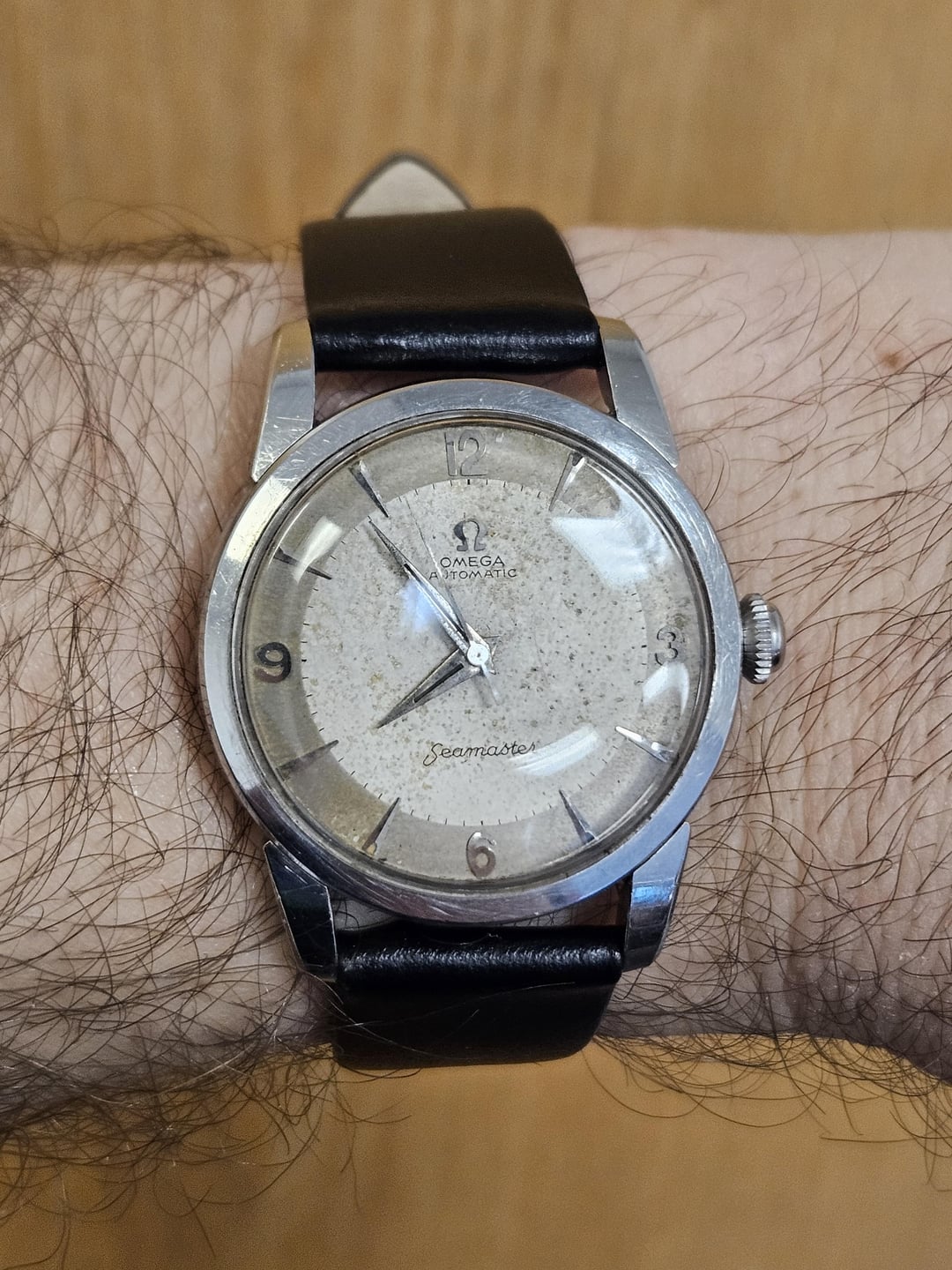 Hey there! For sale is an Omega Seamaster ‘Beefy Lugs’, reference 2846 7 SC. The watch dates to 1956. The watch is in good condition. Almost all of these develop their own unique patina on the dial and case, and this one is no exception. The watch is keeping time well for its age, and all functions of the watch are working as intended. It comes on a black Hirsch strap, although I do have a brown strap if you would prefer that. Album: [https://imgur.com/a/KE0ABP2](https://imgur.com/a/KE0ABP2) Timestamp: [https://imgur.com/a/1UOKeHc](https://imgur.com/a/1UOKeHc) Priced firm at $499, which will include insured CONUS shipping. PayPal or Zelle. No trades. Thanks for looking!