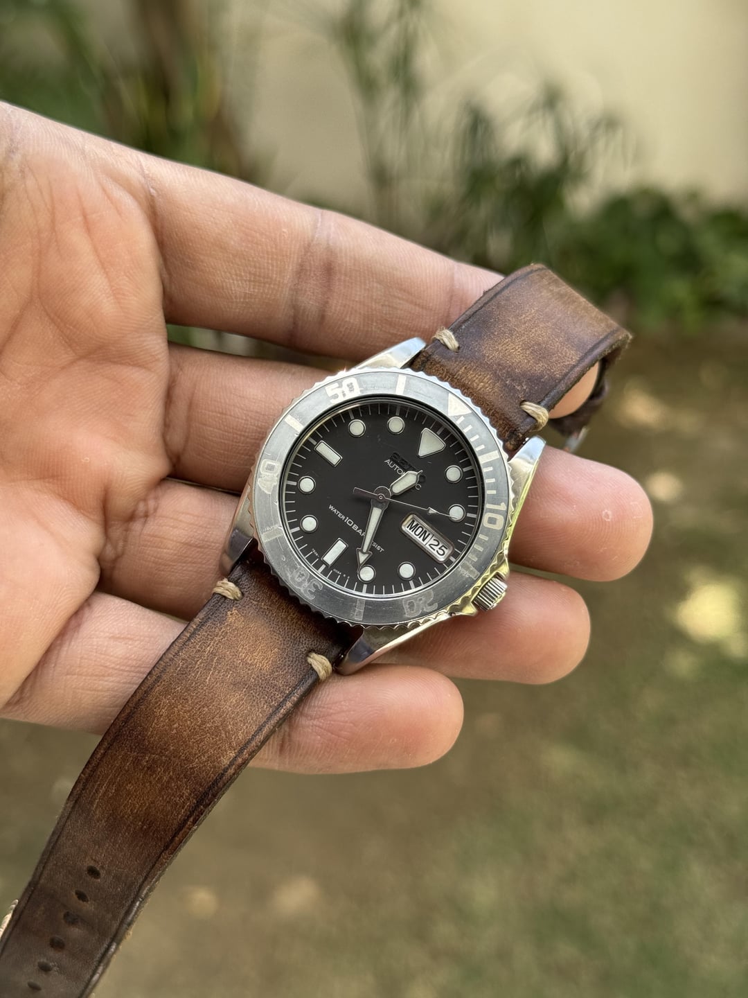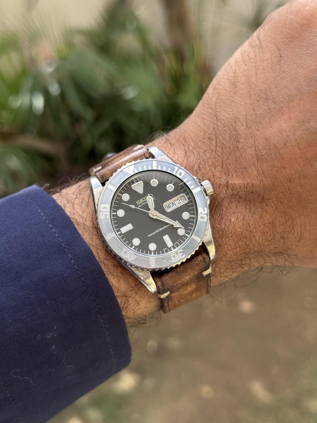 Up for sale is a classic Seiko Skx023 Featuring a 37mm dial size, a perfect compact size. With an interesting ghost bezel that was deliberately achieved by the previous owner through bleaching. Overall the watch has some signs of wear consistent with age. Runs and keeps time no known service history. Price: 230$ through wise shipped via fedex conus