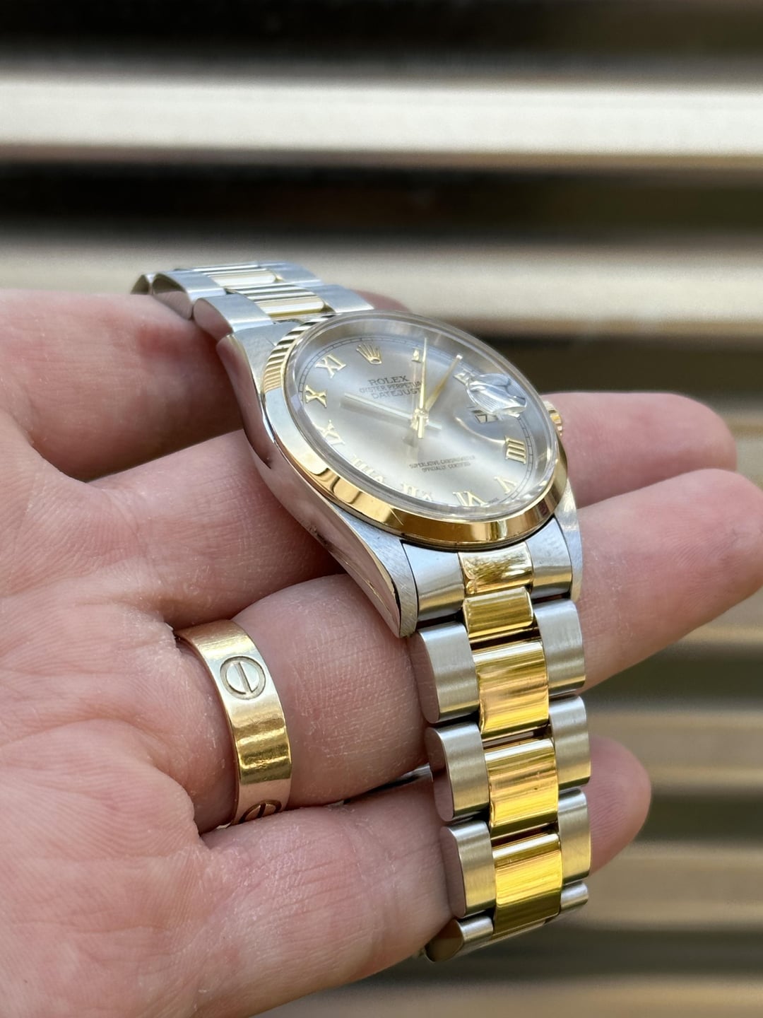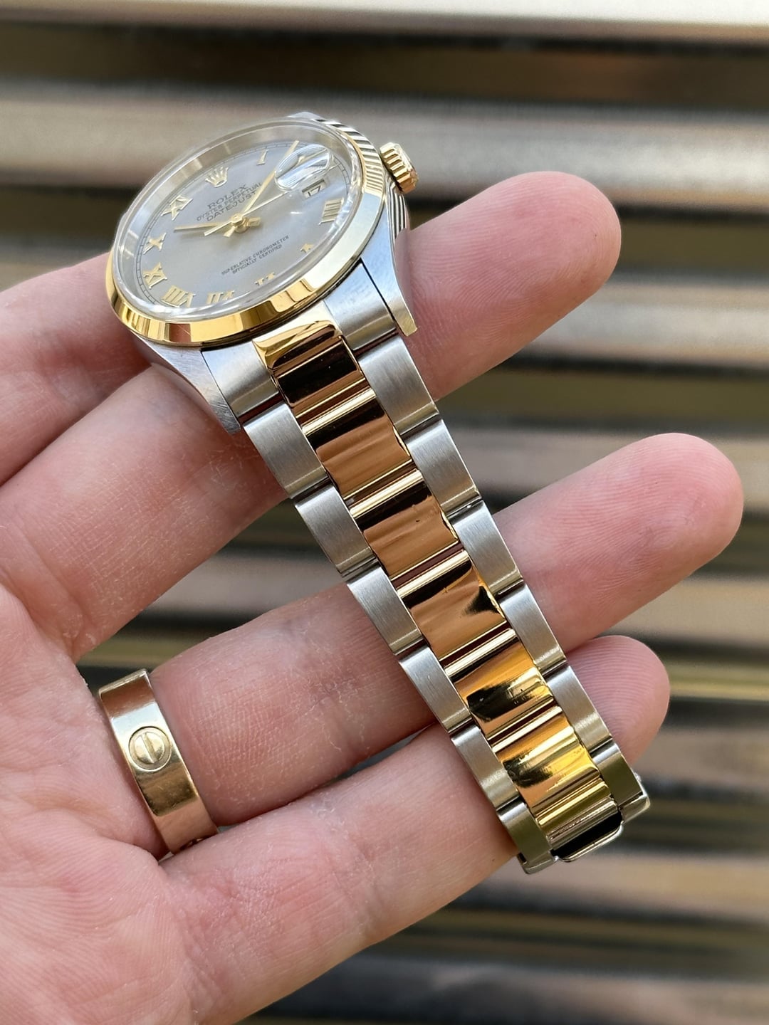 Here is a stunning two-tone Rolex Datejust Grey Roman Numeral Dial reference 16203, with an 18k gold smooth bezel on an oyster bracelet. It comes with Box & Paper. Case-back sticker still intact. Reference number: 16203 Serial number: T****** serial which dates this watch to 1996 COMES WITH BOX, PAPERS, BOOKLETS (See pic 2.) 💰6️⃣5️⃣0️⃣0️⃣+✈️ The watch is in overall very good pre-owned condition - see pics for details. Dial looks absolutely beautiful and it makes this piece really stand out. The case geometry remains intact, with nice sharp edges. Thick lugs and clean high polish surface. No major dings or scratches. The 18k yellow gold smoothbezel is in good shape. The gold on the bracelet and bezel is super clean and shiny. Shines like new! Coronet on the clasp is well defined. Tight bracelet. Quickset movement. Sapphire crystal. Solid no-holes case. Overall, watch remains in great condition and looks as good as new. Full link bracelet Fits about 7.5 inch wrist 💰6️⃣5️⃣0️⃣0️⃣+✈️ We accept Zelle/Wire as payment. Overnight fully insured shipping. I have plenty of references across different platforms so buy with confidence. Follow our instagram @215Watches for daily deals. Thank you for your time [photo album](https://imgur.com/a/LLH41fz) [time stamp](https://imgur.com/a/itZ2vqp)