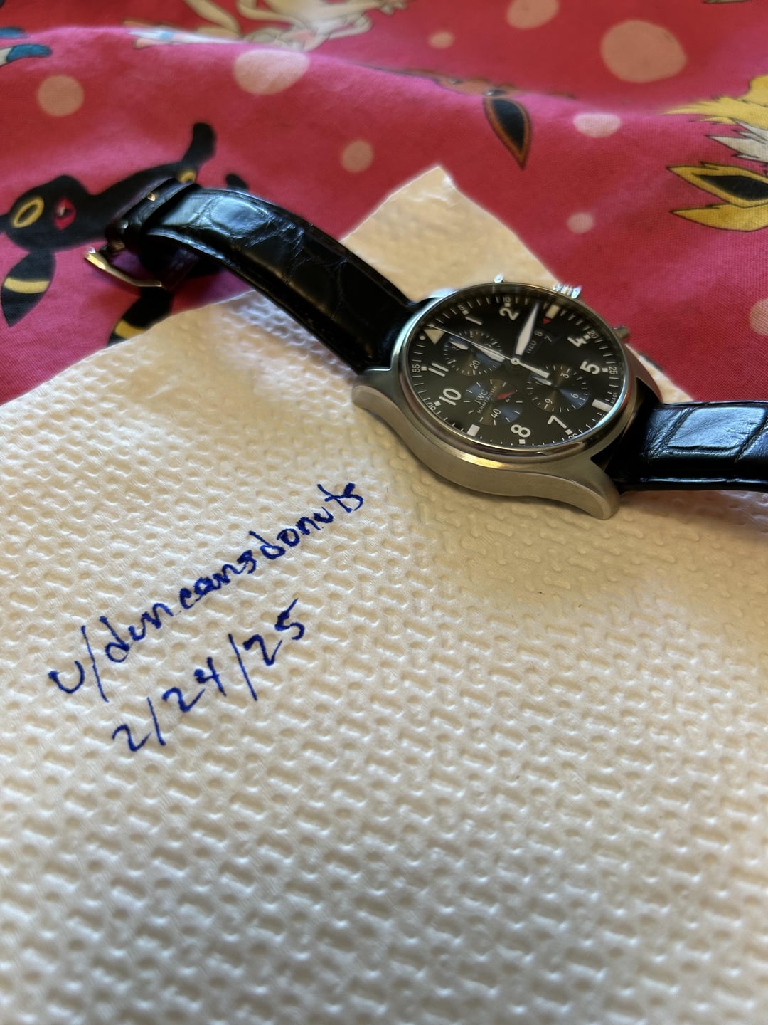 Take flight with the **IWC Pilot’s Chronograph IW377701**, a masterpiece of Swiss craftsmanship designed for those who demand precision, durability, and a bold presence on the wrist. Encased in a **robust 43mm stainless steel case**, this aviation-inspired chronograph features a striking **black dial** with high-contrast white Arabic numerals, offering exceptional legibility. The **day-date complication** adds everyday practicality, while the **chronograph function** ensures accurate timekeeping for any mission. Powered by the **IWC Caliber 79320 automatic movement**, this timepiece delivers a **44-hour power reserve**, ensuring reliability in the skies or on the ground. The **soft iron inner case** protects against magnetic fields, staying true to its pilot’s watch heritage. Finished with a sleek **black leather strap**, the IW377701 is the perfect blend of classic aviation design and modern performance. Whether you’re an aviation enthusiast or a connoisseur of fine watches, this IWC Pilot’s Chronograph is a must-have addition to any collection. Timestamp/pics: [https://imgur.com/a/kqFrvQU](https://imgur.com/a/kqFrvQU) Watch only. Asking $2850. Open to trades and I prefer them. Here is my wishlist but I’ll look at anything: Pacifique tonneau w/Roman nums and bracelet Cheaper Large reverso XL tank auto Blue monaco Octo finissimo BB41 or BB Royal Sinn U50 Frederick Constant pieces