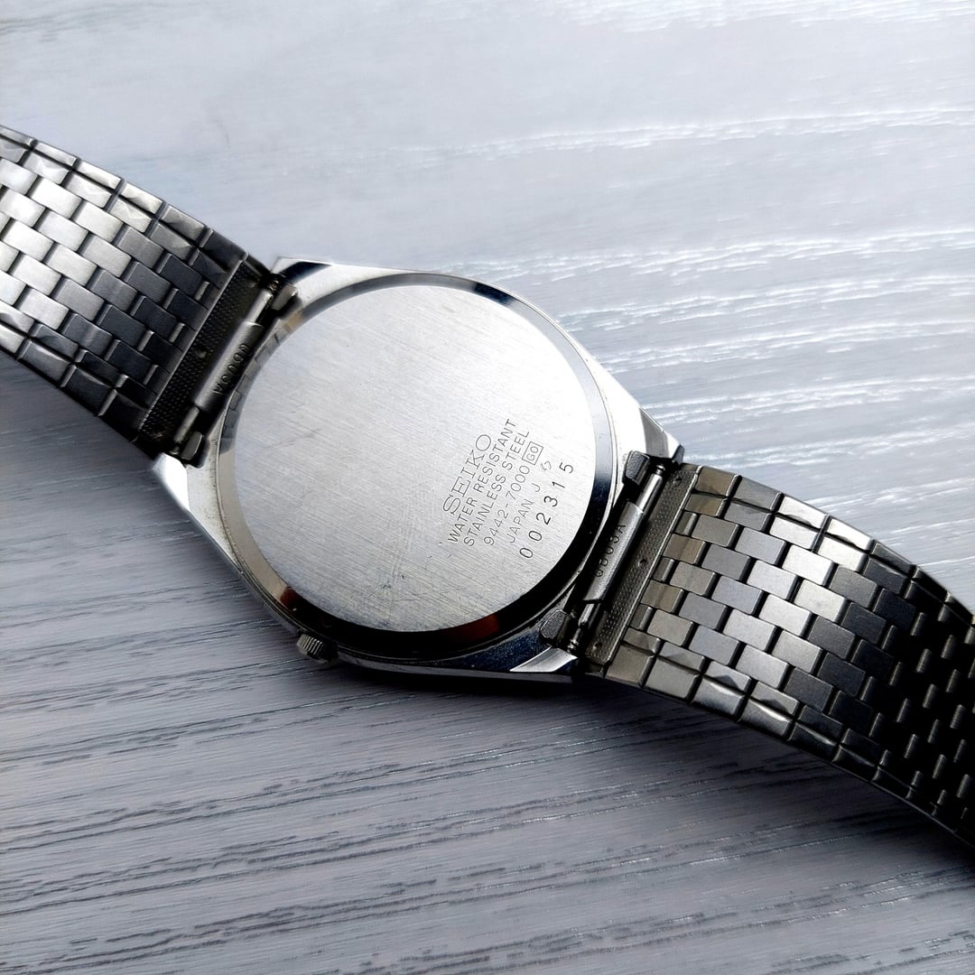 Up for sale Seiko 9442-700 the watch comes with beautiful frosted ice texture The bracelet and case features a matching frosted iced texture, it presented in original unpolished state, with sharp edges and authentic factory 'frosted' finish, Another notable poin of this watch is it feature with twin quartz movement, typically found in high-end models like King Quartz and Grand Quartz known for their outstanding accuracy and reliability. Ref No. 9442-7000 Production Year : 80's. Case 34mm incld crown lug to lug 39mm thickness 6.5 mm Comes with original bracelet fit up to wrist size 20 cm / 7.87 inch The movement is functioning perfectly with excellent accuracy, and has been fitted with a new battery. All functions are operating normally. Looking to get $185 shipped. Payment via Paypal F&F and G&S + 4.6%. Video of watch : https://www.instagram.com/reel/DHRMizJyINC/?igsh=ZW1rang3b2Rza2F0 for more collection please follow my instagram: https://www.instagram.com/lougeposh/ Please COMMENT FIRST before sending me a pm or chat. Tracking number (Airwaybill) will available within 3 days once payment confirmed