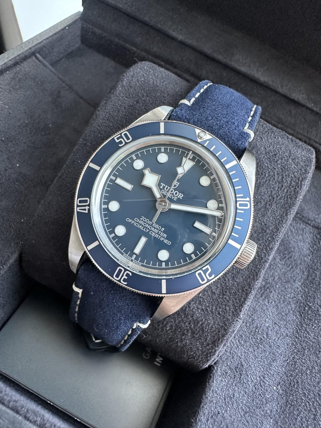 Hey all, Timestamp: https://imgur.com/a/tgcvulh Pictures: https://imgur.com/a/HFl57RD Selling my Tudor Black Bay 58. This gorgeous watch comes on Tudor’s dressy “Soft Touch” blue suede & leather strap, secured with an adjustable clasp. It has a unidirectional dive bezel, the classic snowflake hands, green lumed indices and an awesome domed sapphire crystal. It has a 70hr power reserve and its water resistant up to 200M. This blue BB58 is a great addition to any collection or a perfect first watch for new collectors. Condition: Very gently used, looks almost new. The sides of the case have barely noticeable scratches. There are also superficial scratches on the brushed caseback and clasp. The suede side of the strap is supple and soft and the leather side is still crisp without any cracks. On the wrist, the watch appears new with no noticeable wear for a 4 year old watch Includes: Box with outer sleeve, manuals, and warranty card dated June 2021 - Covered by Tudor's international 5 Year Warranty until 2026. Price: $2,200 which includes FedEx Express insured shipping within the USA. Payment accepted is bank wire or Zelle Please feel free to reach out if you have any questions or if you need more pictures. I’m happy to jump on a FaceTime to show you this watch and answer any questions.