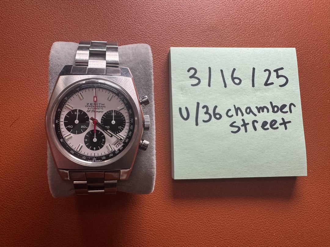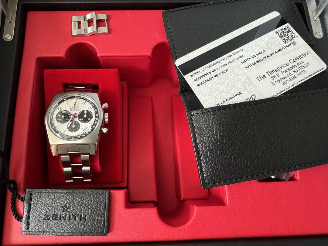 Howdy fellow sickos. Up for sale is my Zenith Chronometer Revival El Primero A384. This is an absolutely stunning, perfectly sized watch at 37mm, with the tonneau case giving it a ton of wrist presence and the absolute masterpiece of Gay Frères ladder bracelet. Combined with the iconic panda dial, it's a work of art. It also looks amazing on a black leather strap. You can check out what that looks like here: [https://www.hodinkee.com/articles/zenith-el-primero-a384-revival-hands-on](https://www.hodinkee.com/articles/zenith-el-primero-a384-revival-hands-on) Countless articles and videos have been made about this watch. I like IDGuy's: [https://youtu.be/eGlvvJEgV84?si=JwWsMHaqdMugbJBT](https://youtu.be/eGlvvJEgV84?si=JwWsMHaqdMugbJBT) Here is a video I took of the watch: [https://photos.app.goo.gl/sB8Kv7wku3XVCBX98](https://photos.app.goo.gl/sB8Kv7wku3XVCBX98) Happy to FaceTime with you to show you the watch and answer any questions you might have. I am selling this and other watches in my collection to consolidate down to just 1-2 pieces. Asking $4999 and hoping it finds a good home. If you're interested in what I'm selling this to fund it's a truly stupid story and I'll tell ya if you message me lol. Zelle preferred. Thanks! #