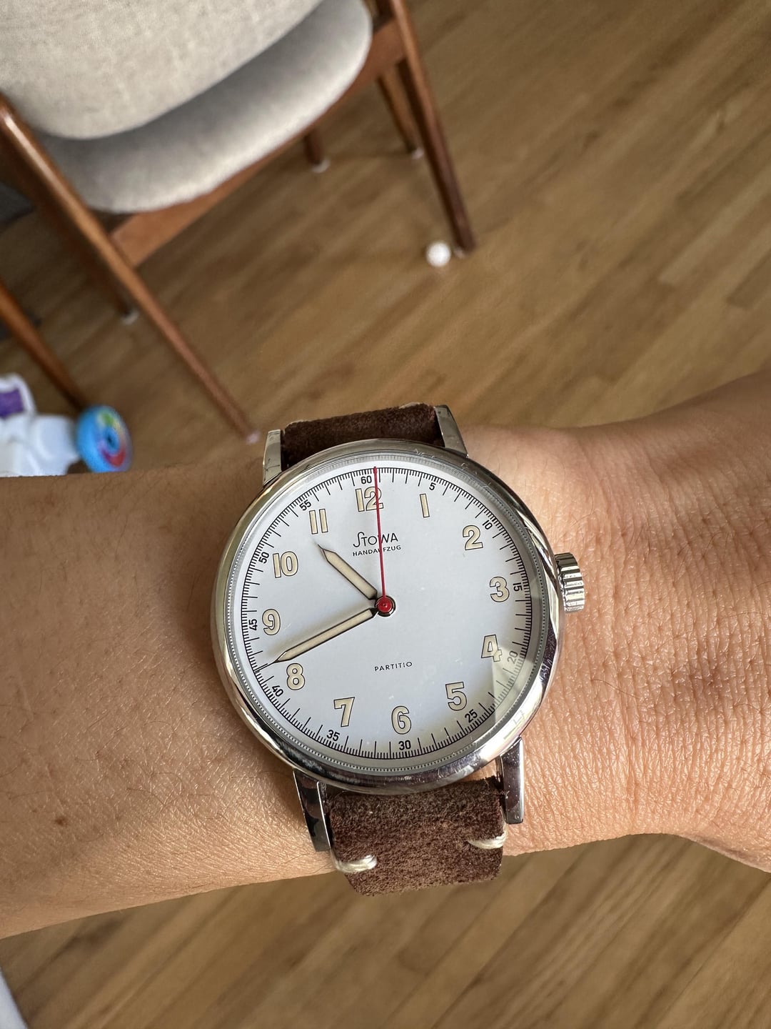 Selling a Stowa Partitio Classic Manual Wind Impulse buy from about a month ago here on watchexchange. Wore it twice but never outside. Description from previous seller: The watch features nickel coated hands and Superluminova that pops off the dial. For sale is everything in the photos, the watch itself, aftermarket chocolate suede strap, the OEM manual, and a grey suede Everest travel pouch. Case Size: 37mm Height: 9.8mm Lug to lug: 46.9mm Lug width: 18mm Movement: Top Grade Sellita SW 210 \--- Sale Price: $515 I accept PayPal or Zelle. If PayPal, either F&F or G&S (Plus fees) from buyers with established history. Shipping only within US. Timestamp: [https://i.imgur.com/viQQPGT.jpeg](https://i.imgur.com/viQQPGT.jpeg)