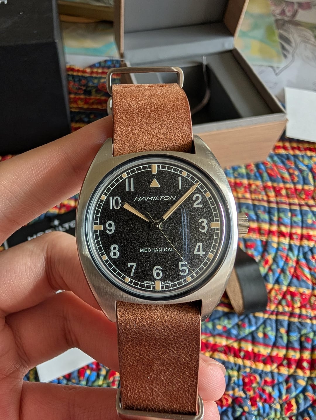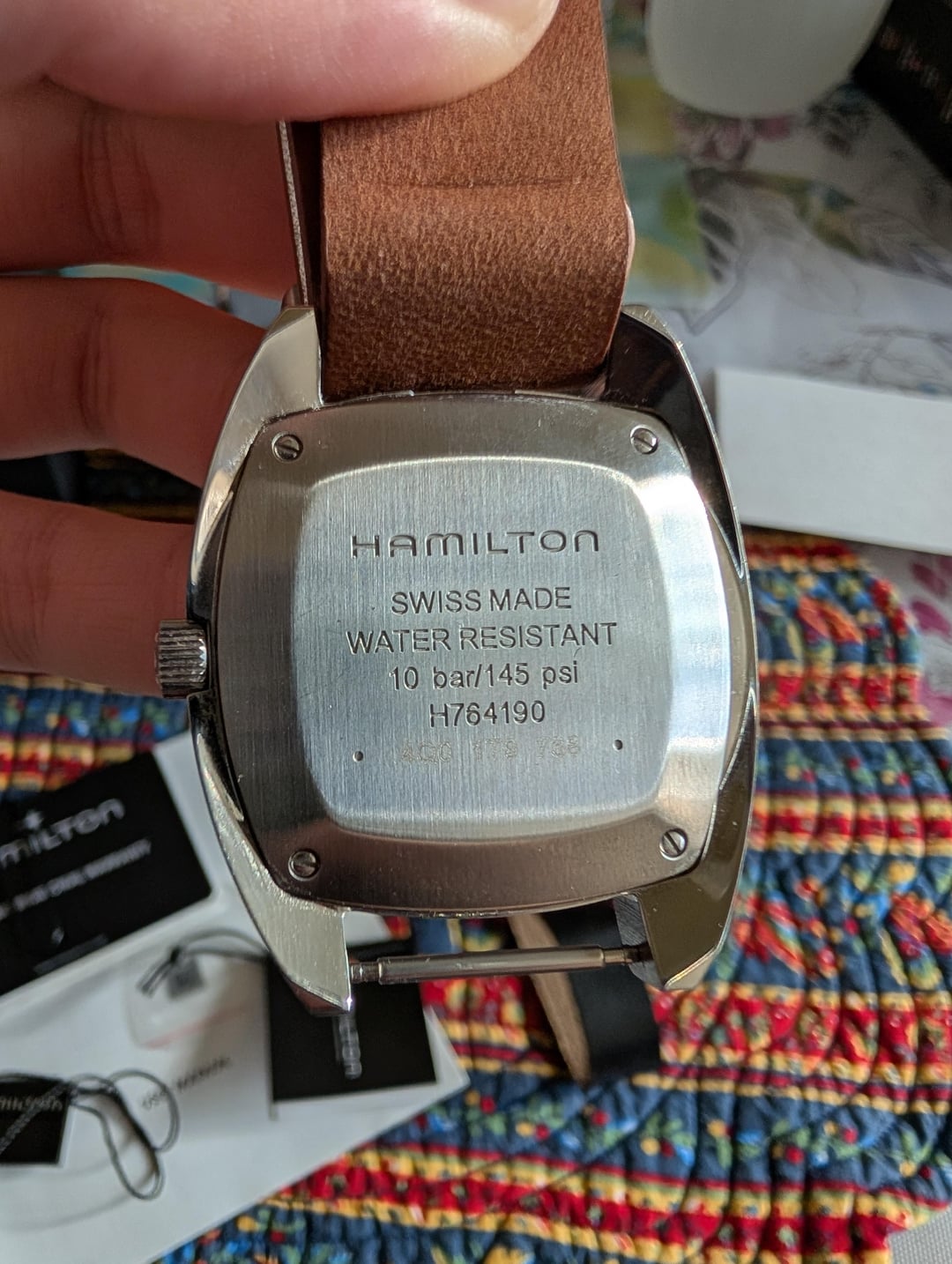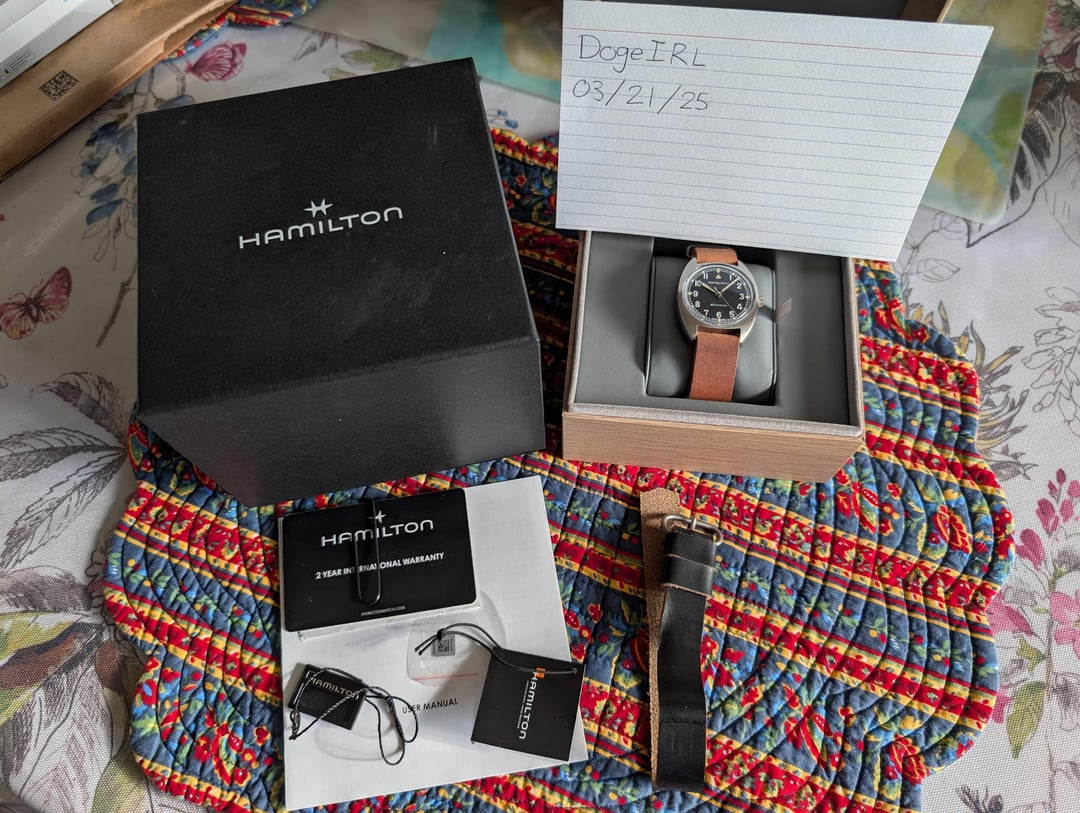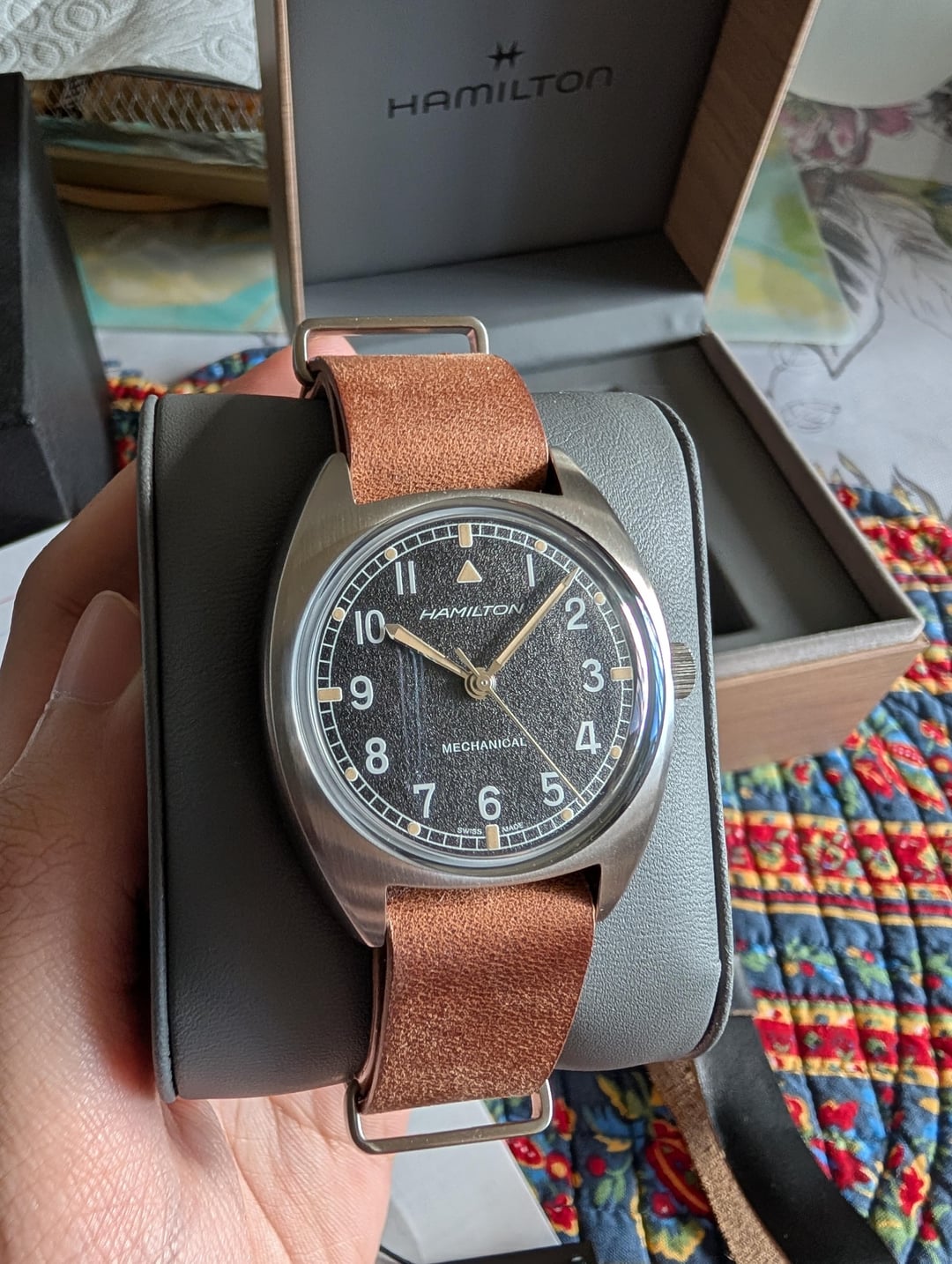 **Additional photos:** Please see the album above. **Timestamp:** [Here](https://www.reddit.com/media?url=https%3A%2F%2Fpreview.redd.it%2Fwts-hamilton-khaki-pilot-pioneer-mechanical-v0-xf4xgjui45qe1.jpg%3Fwidth%3D4080%26format%3Dpjpg%26auto%3Dwebp%26s%3D6ba71c4ca1ca7faeae025c7ecdb5974337a8c6fc) **Price: $450 shipped CONUS via PayPal F&F/Zelle. No trades at the time.** Hello everyone, Picked up another handwinding watch so I want to move this one on. There's almost no wear on the watch except for a creasing mark on the band and hairline marks on the back of the lugs. This is my second time owning this watch and I think it offers a lot for the money. It has a nice textured dial but keeps most of the original design from the Hamilton W10. It has a nice crown that is easy to use and the handwinding movement provides a satisfying click and 80 hours of power reserve. The watch will come with the original outer and inner box, manual, warranty card (undated, so not sure if usable), hang tags, and original purchase receipt from Jomashop (I am not the first owner). The watch comes on the original leather nato which is nice and will also come with a 18mm leather strap I got from Etsy. The Hamilton movement is running great at around -2 seconds per day. Please PM me with any questions you might have and leave a comment here before doing so. Thanks! **Watch specs:** * Case Size (without crown): 36mm * Case Thickness: 10mm * Case Lug to Lug: 42mm * Case Material: Stainless steel * Crystal Material: Domed mineral with AR coating * Water Resistance: 100m * Lug Width: 18mm * Movement: Hamilton H-50 (hand-winding)