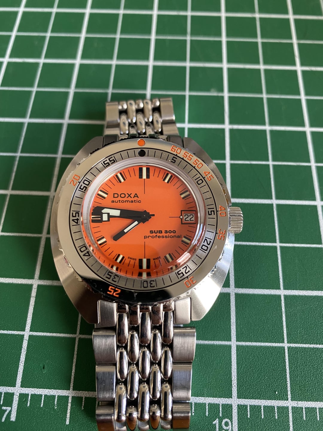For sale is my esteemed and loved Doxa 300 'retro model' with the domed crystal and metric no-deco dive time bezel. It's been fault-free and dependable since I've owned it (2021). The movement is an ETA, with 38h power reserve beating at 4.0 Hz. Stainless steel case, Diameter 42.50 mm x 45.00 mm, Height 13.40 mm, Screw-down crown, Water resistance 300 meters / 984 feet, stainless steel, screw down case back. On a polished steel Beads of Rice bracelet. The clasp has seen the most wear but it presents as patina rather than any actual damage or dings to the metal. It's a real-world workhorse. Two scuffs on the polished bezel from before I owned the watch. The pictures speak for themselves. Asking $1999 USD plus shipping. Paypal F&F only. "Full Kit" mentioned includes the following \-Outer Box, Inner zippered clamshell case \-2x aftermarket straps (uncle, strapco) \-All original links, booklet, warranty cards dated 2021