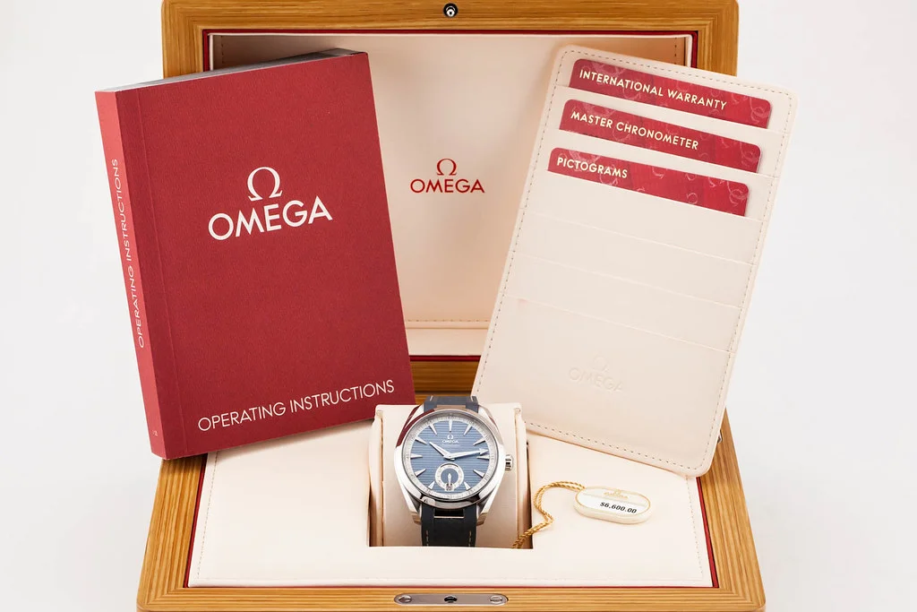 Up for sale is an excellent condition Omega Aqua Terra 150M Small Seconds in Slate Blue, reference # 220.12.41.21.03.005. It comes complete with all boxes, papers, booklets, hang tag, and Omega Warranty Card dated November 2023.