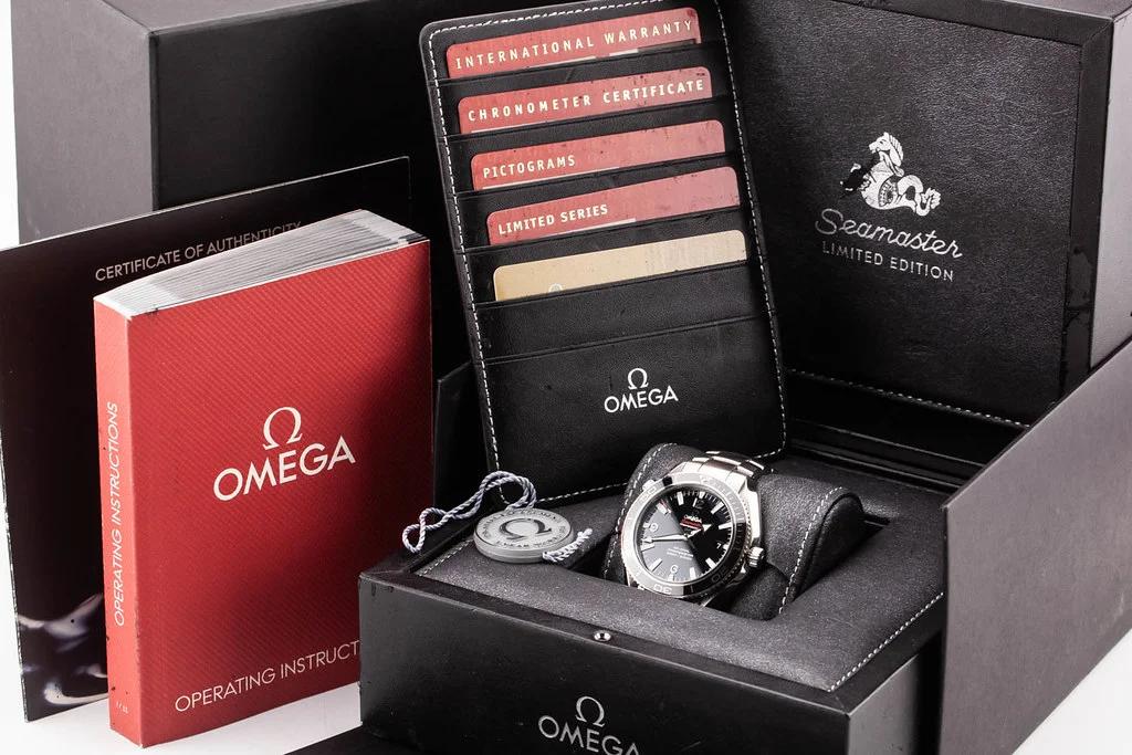 Up for sale is a mint condition Omega Planet Ocean 2500 Liquidmetal Limited Edition 42mm Black Dial on Bracelet, reference # 222.30.42.20.01.001. It comes complete with all boxes, papers, booklets, hang tag and Omega Warranty Card dated November 2010. One of 1948 pieces. Leather box is in normal condition for its age. The watch received an extended warranty in November 2014 and underwent full Omega Boutique Service in June 2023.