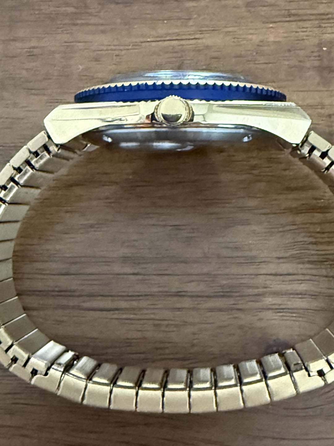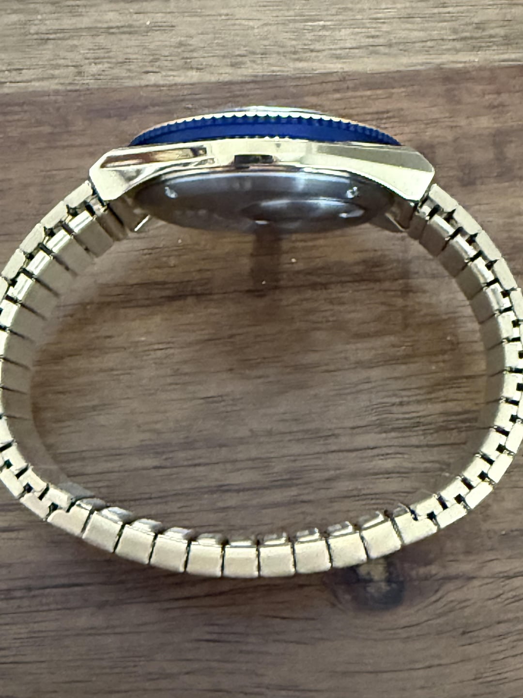 For sale is a timex lapis lazuli quartz watch. Near mint condition, full kit. Japanese movement. 36 mm face. Adjustable non-ratcheting bezel. Lumed hands and hour indices. Nice touches like the blue on the bezel as seen from the side. Relatively new. Band is a stretch type band. Ships USPS in the USA. For sale at $120. I accept most forms of payment. No trades.