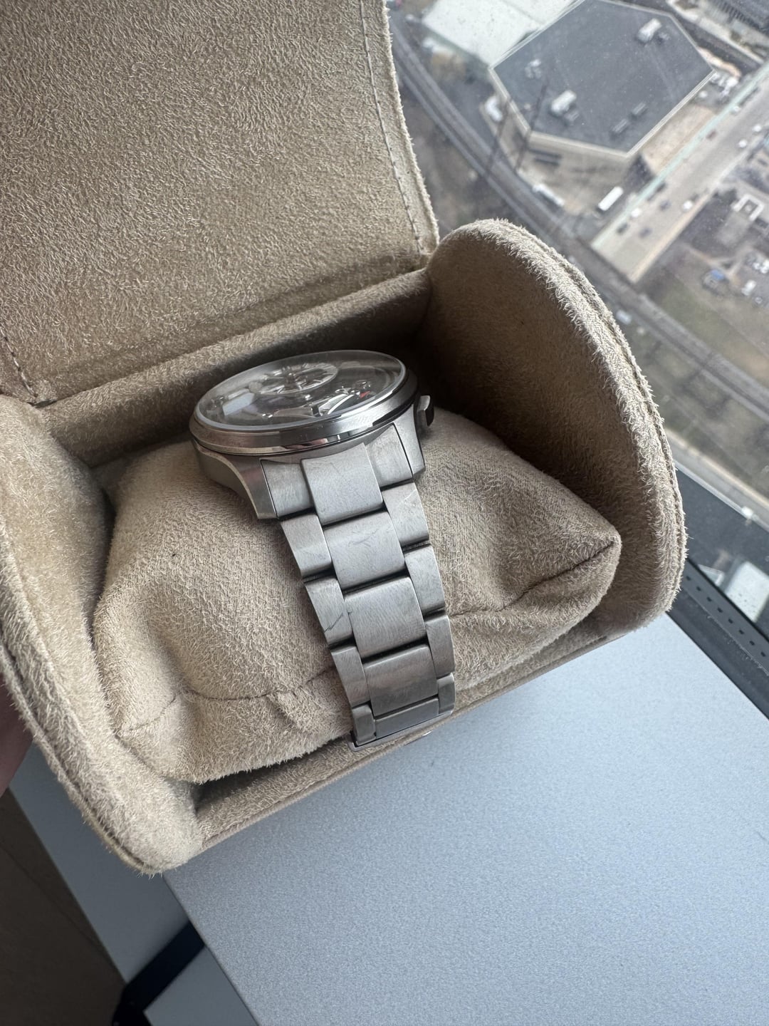Hi r/WatchExchange! For sale is my rare Christopher Ward Bel Canto Verde Green. This limited edition of 300 pieces was the follow-up to the blue model, and sold out in minutes after release. This titanium watch features the sonnerie au passage complication that put Christopher Ward on the map, chiming at the hour every hour to turn the passage of time into an audible experience. The unique green dial is incredibly dynamic and shifts from clover green to teal depending on the lighting and angle. This watch was ordered on the optional quick-change titanium bracelet, which features screw adjustment and micro-adjustment deployment claps. This watch was worn and loved and shows some signs of wear on the quick release bracelet. This particular example is numbered #69 of 300 (nice). Condition: • Case: Mint condition with no visible signs of wear • Strap/Bracelet: Normal signs of wear with surface level scratches on the bottom endlink and clasp. Cannot be felt with fingernail so should be able to refinish if needed. • Movement: Running perfectly Includes: • Watch head • Titanium bracelet with all original links • Inner and outer box • Manuals and warranty card Transaction: • Delivery: includes insured shipping by USPS Priority Mail to continental US upon payment. Alternative shipping is possible at buyer’s expense. Available for physical transaction if in Philadelphia area • Payment: Zelle, wire transfer, or Paypal G&S +3%. Cash is acceptable for physical transaction if in the Philadelphia area Price: $3,999. Willing to negotiate on price, but no trades please. This will be my second transaction on r/WatchExchange and happy to provide a reference if desired. Happy to answer any questions or provide additional pictures or a video of the chime in action if there is interest!