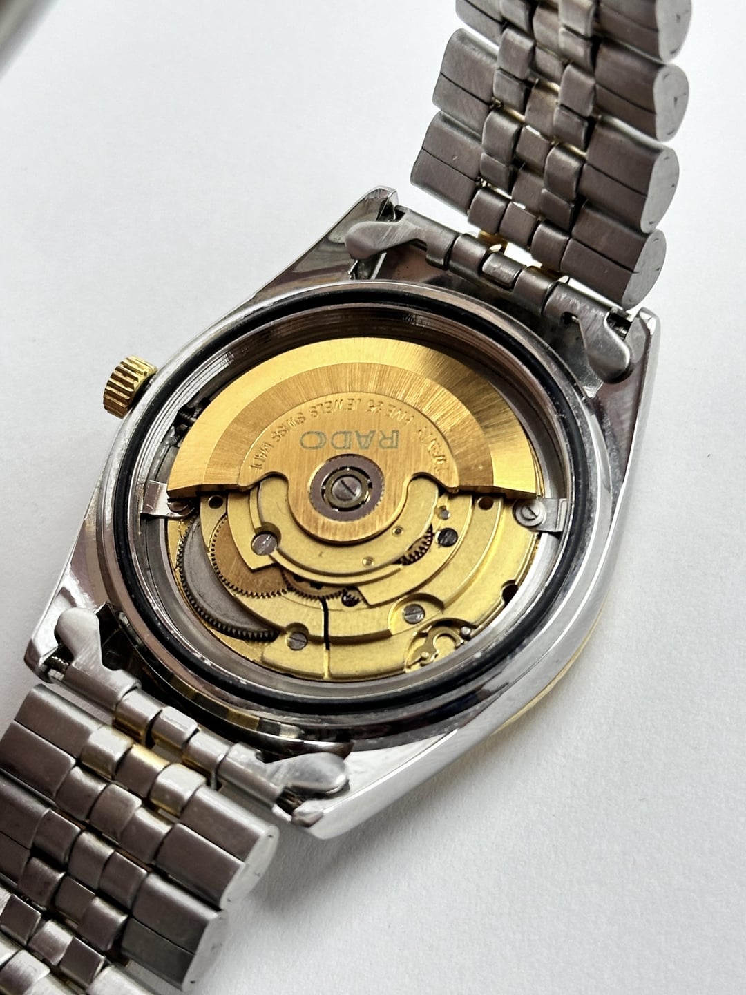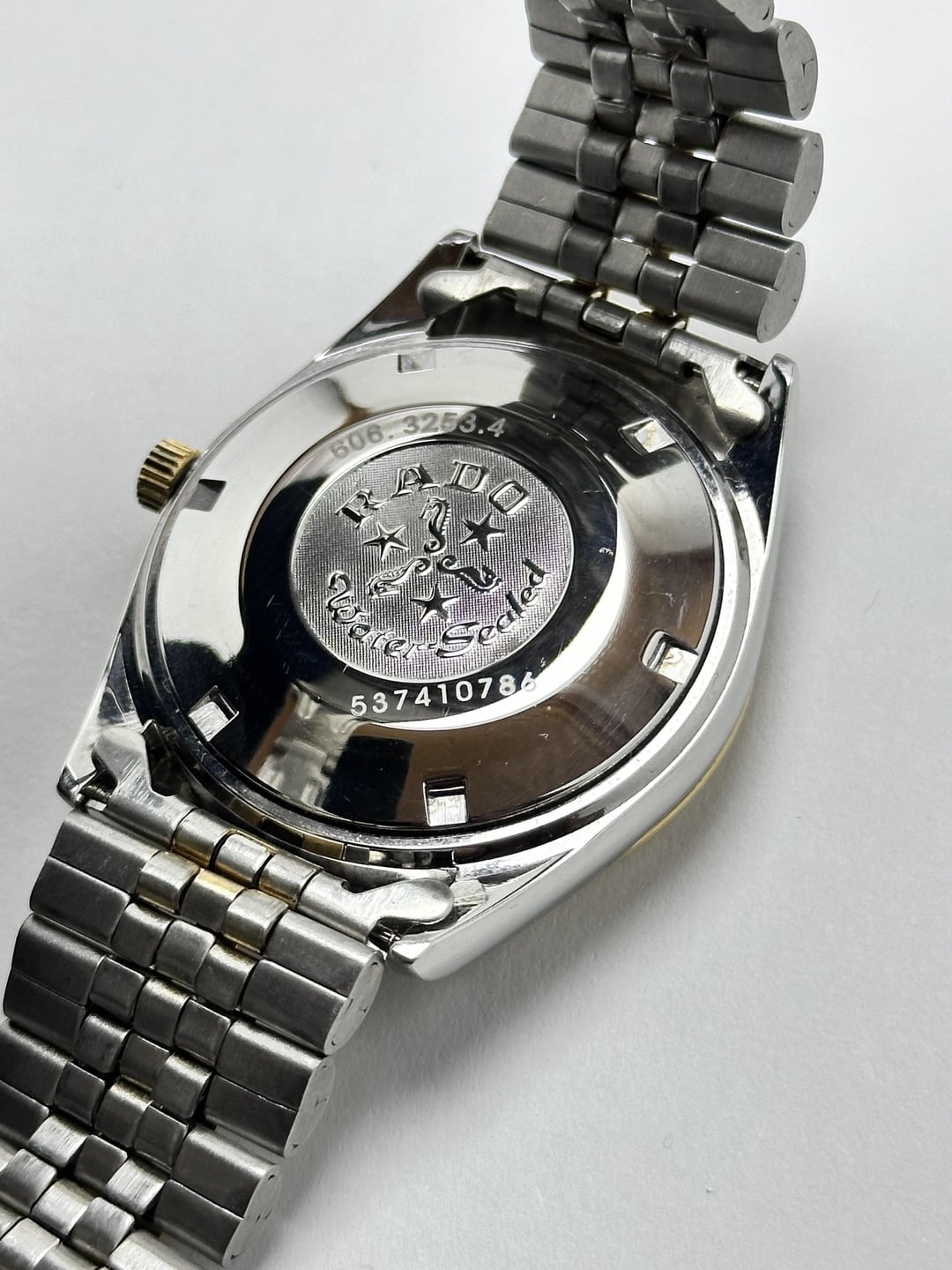 Timestamp: https://imgur.com/a/Gm3sY0Z Up For sale 1980’s Vintage Dual Tone Rado Purple Horse Condition: This watch is in good working order and excellent cosmetic condition. It has likely been polished or restored at some point, but it remains a stunning timepiece. There may be some signs of wear due to its pre-owned nature. Please carefully examine the photos for a closer look at its condition. Specifications: Case: 36mm Band: Rado Jubilee Movement: Automatic ETA 2836-2, Swiss Made, 25 Jewels Crystal: Acrylic (Mint Condition) Day/Date: English/Arabic Case Back: Solid Screwback, ref: 606.3253.4 Crown: Mint, marked with the Rado Anchor Logo Price: $780 Shipped Shipping: From Maryland USA, via USPS Payment: Paypal FF and Zelle preferred I am also a seller on Ebay, happy to provide link to my shop for verification purposes. Message me for any additional information.