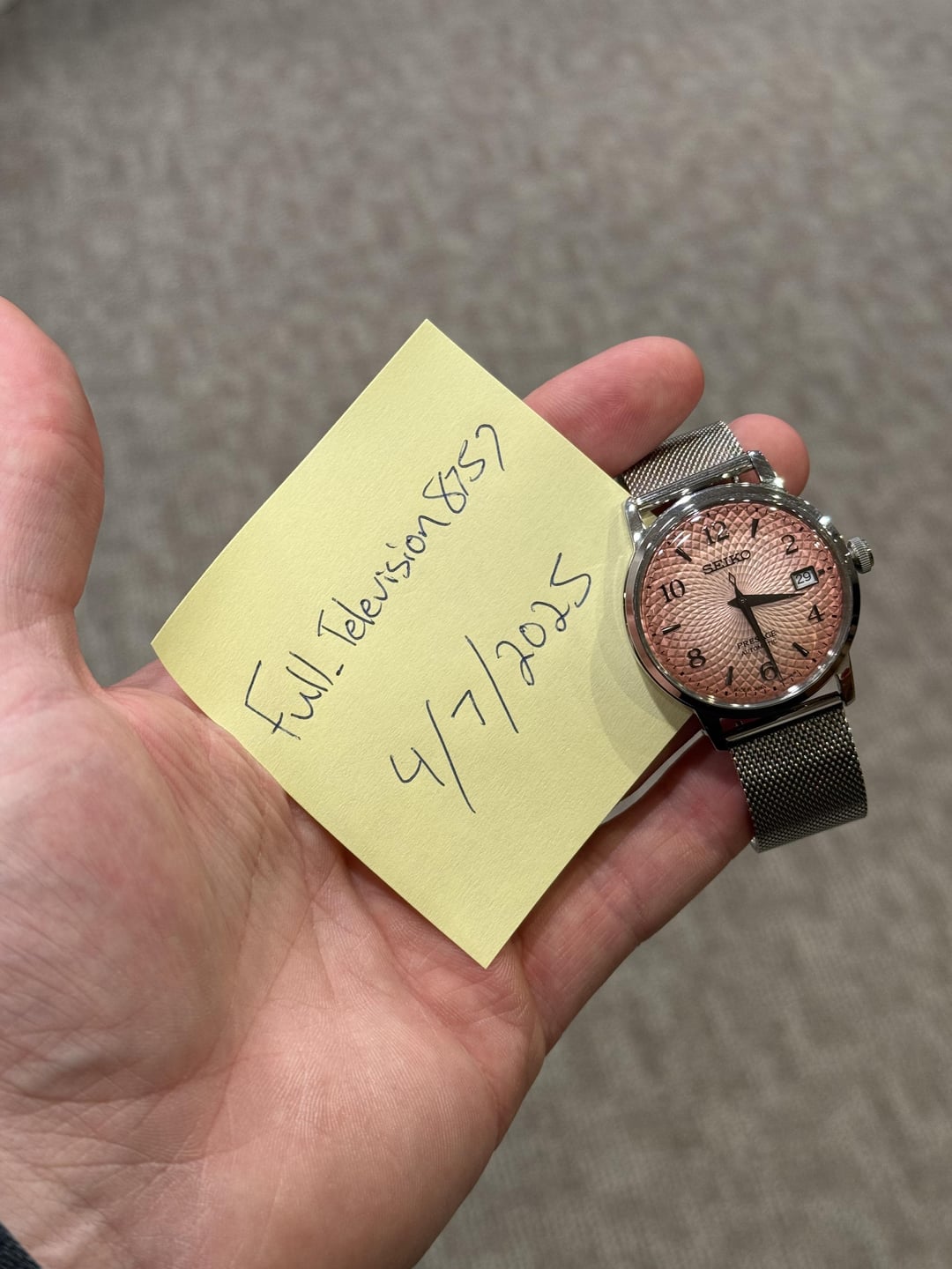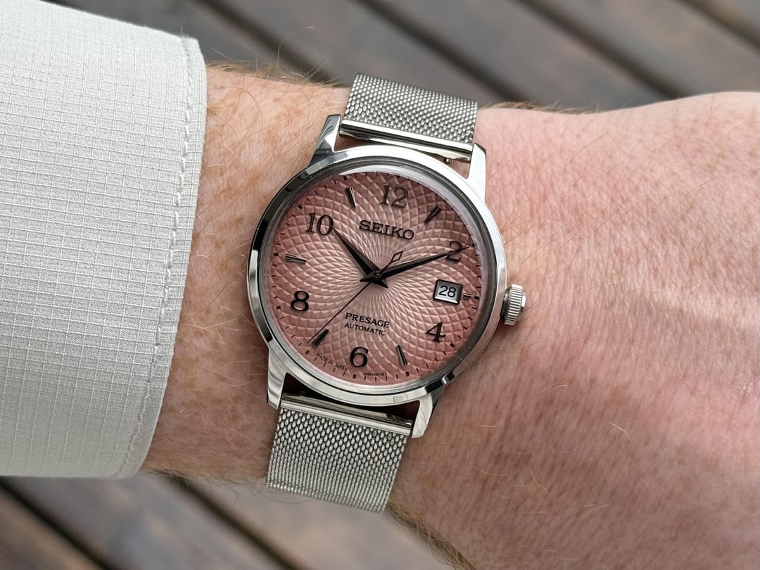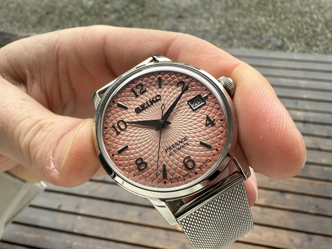 Tequila Sunsets on the beach sound pretty good right about now Model: Seiko Presage Ref# SRPE47J1 Case Material: Stainless Steel Case Dimensions: 39 mm Bezel: Stainless Steel Smooth Bezel Dial: Pink "Tequila Sunset" Dial Band Material: Stainless Steel Mesh Style Bracelet. Also Comes with Brown Leather Deployant Max Wrist Size: 7.75 in. Movement: Automatic, Mechanical Accessories: Comes with original box. manual and hang tag Condition: Very nice preowned condition with light scratches and wear to the case and bracelet. Watch has been tested and is running well. Price: $580 Shipped. Credit Card Price. WA Residents subject to sales tax. Email: [email protected] Instagram: porcellojewelers