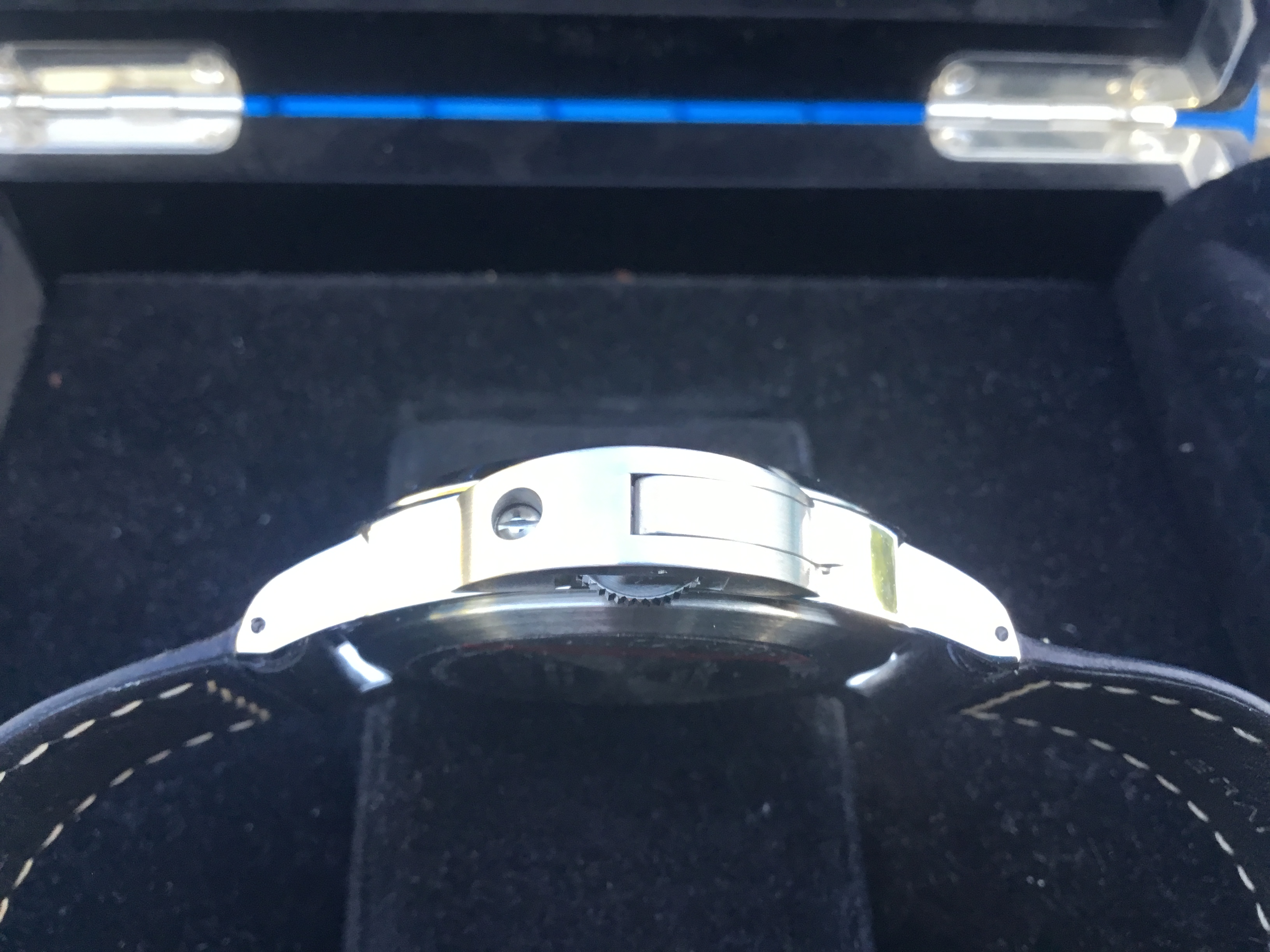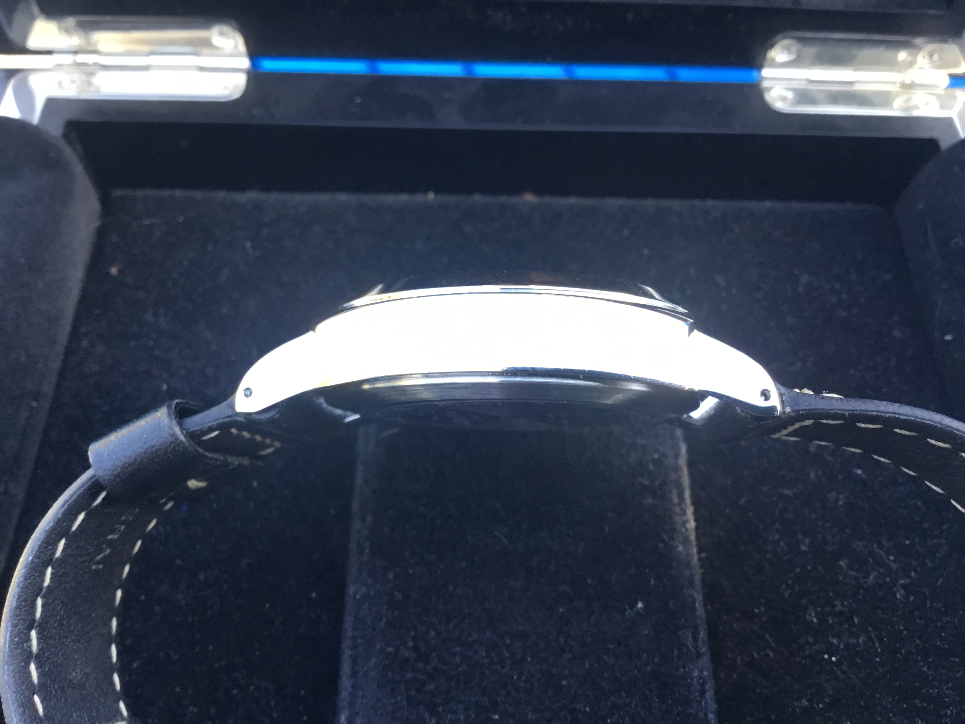This watch was originally purchased at an Authorized Dealer in 2016. It was later resold by a well-known online reseller of fine timepieces in 2021. Original standard issue buckle for this watch is a pin buckle on black calfskin strap. This watch was fitted with an OEM stainless steel double-folding deployent buckle, adding extra value.
