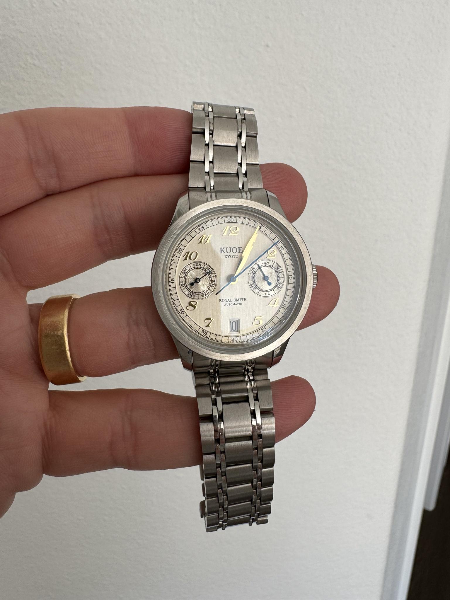 Looking to sell my Royal Smith from Kuoe. Only wore it one week on a trip to London, comes with everything it came with including all links, case, bag and extra leather strap. Kuoe Royal Smith 90-010 Movement: Cal. 9122 Citizen Miyota Triple Calendar Function with Date, day of the week and Month. Vertical brushed finish on the dials and blue hands for center seconds and subdials. Crystal is dome sapphire glass with AR coating. Citizen Miyota - Cal.9122 / Automatic with hand-winding and stop-seconds (Hacking) Dome-shaped sapphire glass with AR coating and AF coating Water resistance: 5 BAR Power reserve: \~40 hours Price: $480 Shipped [Timestamp and more photos ](https://imgur.com/a/e9mo7BV) First time posting a watch for sale, but have a history in r/mechmarket and r/GameSale