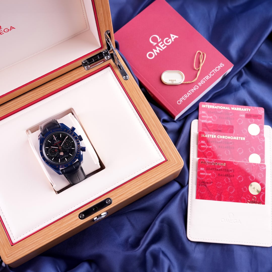 | Omega Speedmaster Moonphase 304.33.44.52.03.001 FULL SET Box & Papers Blue 44mm rocketshipluxe (325) |