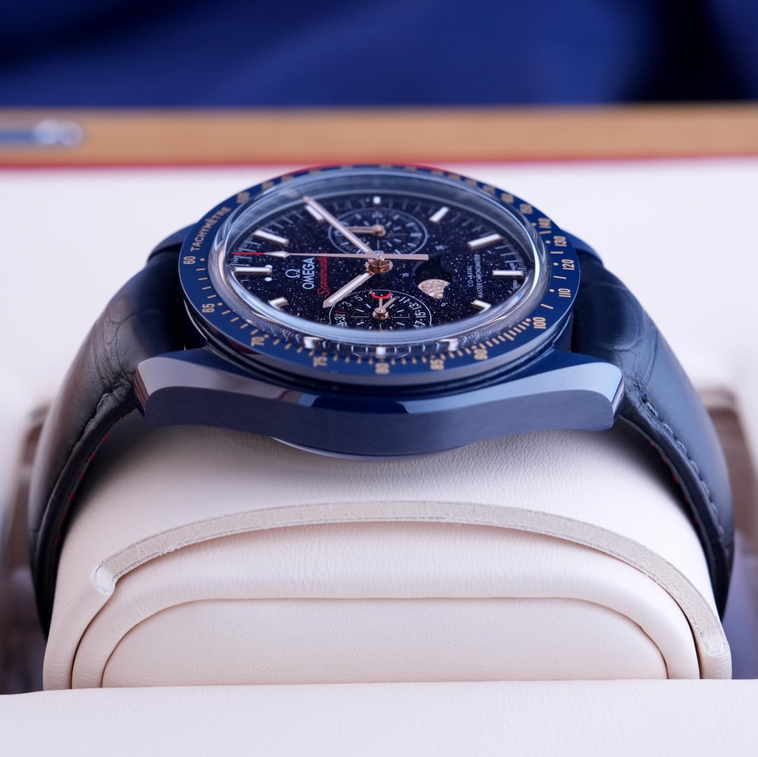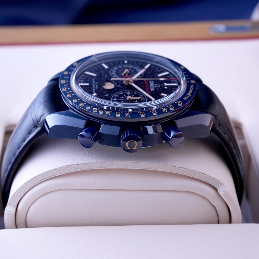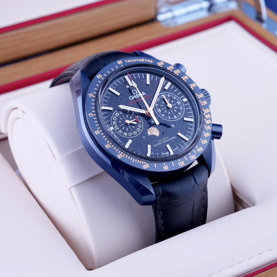 Omega Speedmaster Moonphase 18K Rose Gold Aventurine – Reference 304.93.44.52.03.002 **Price:** $10,449 Shipped **Timestamp:** [https://imgur.com/58k7o9y](https://imgur.com/58k7o9y) The most sought-after Omega in its collection. Omega Speedmaster Moonphase, known as the "Blue Side of the Moon" is set on a 44.25 mm blue ceramic case and bezel features a stunning blue Aventurine dial, reminiscent of a star-filled night sky. * Case & Bezel: 44.25mm Blue Ceramic with Sedna Gold Tachymeter Scale * Dial: Blue Aventurine with 18K Sedna Rose Gold hour markers and hands * Movement: Omega Master Chronometer Co-Axial movement with Moonphase complication **Condition:** In excellent condition **Complete Set Includes:** Double Box, Booklet, Pictograms Card, Master Chronometer Card & Warranty Card Located in: Los Angeles, CA Shipping: Fast and fully insured via FedEx Overnight I stand behind each of my timepieces and guarantee 100% authenticity. I’m happy to hop on a call or FaceTime to show you the watch and answer any questions. Please don’t hesitate to reach out!