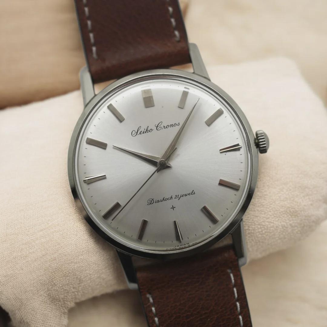 The Cronos was launched in 1958 as the first three-hand men's watch made at the Daini-Seikosha Kameido factory. Thinner than conventional watches, it delivered high performance and had a clean design. The elimination of the balance screw and improvement of the balance wheel bearing resulted in a movement that was even thinner than the one used for the Marvel series and was also highly accurate. This model is characterized by its delicate, thin bezel, slender hands, and long, clean, three-dimensional indexes. The typeface of the logo is also very elegant. Brand: Seiko Model: Cronos Case: 36mm Lug to lug: 44mm Strap: Leather with Seiko buckle Box/papers: No Location: Los Angeles Price: $999 or best offer CA residents may be subject to sales tax Pictures: [https://imgur.com/a/ISZZmOy](https://imgur.com/a/ISZZmOy) Timestamp: [https://imgur.com/a/oHr5NAq](https://imgur.com/a/oHr5NAq) CONDITION & SERVICING \-Dial and hands are in excellent condition. \-The case is in excellent condition. \-The caseback has the original sticker in place. \-Recently serviced by our watchmaker.