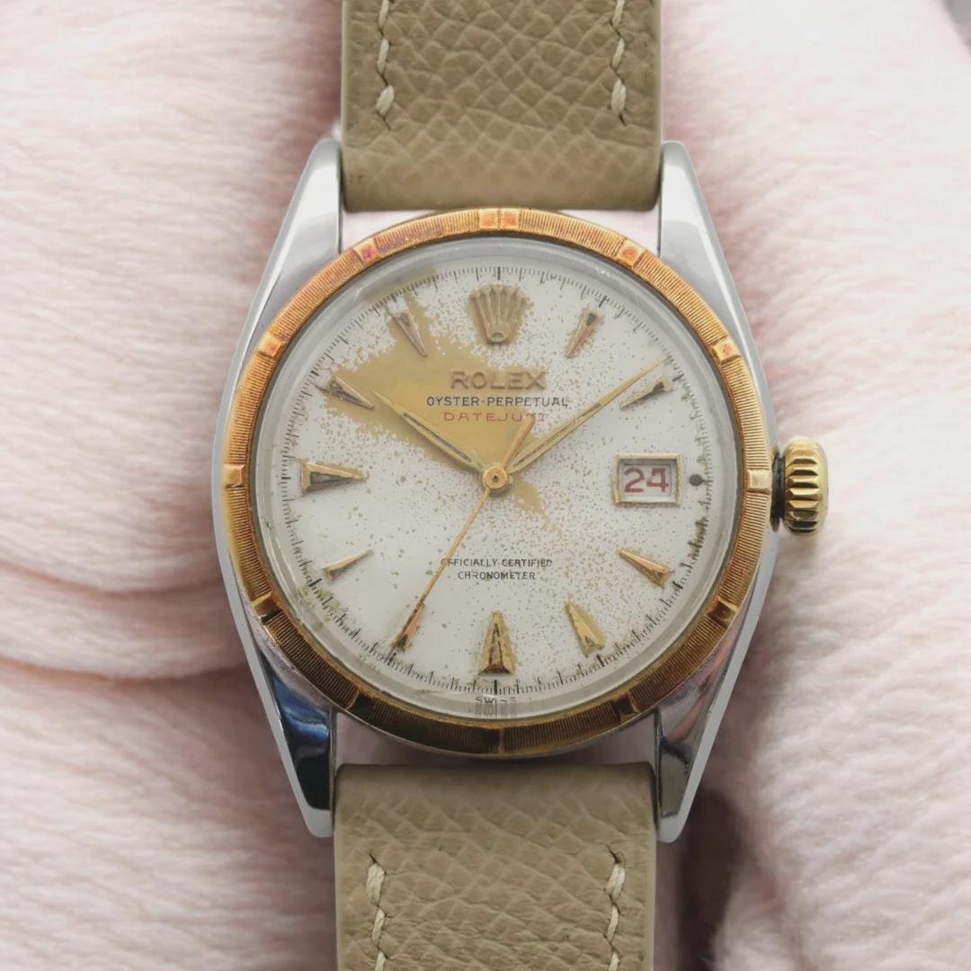 The Rolex Datejust is one of the most iconic and recognizable watches in the world, known for its classic design and timeless elegance. The watch was first introduced by Rolex in 1945, and has since become one of the brand's most popular and enduring models. The term "ovettone" translates to "big egg" in Italian. In the context of watches, it refers to a specific style of case shape that resembles an elongated or oversized egg. Ovettone- or more commonly known as "Bubbleback" style cases were popular during the mid-20th century, particularly in the 1940s and 1950s. Brand: Rolex Model: Red Datejust Reference: 6305 Year: 1953 Case: Stainless steel with yellow gold engine turned bezel Size: 34mm Lug to Lug: 44mm Box/papers: No Location: Los Angeles Price: $6,999 or best offer CA residents may be subject to sales tax Pictures: [https://imgur.com/a/mbN9peQ](https://imgur.com/a/mbN9peQ) Timestamp: [https://imgur.com/a/zVk8s88](https://imgur.com/a/zVk8s88) CONDITION & SERVICING \-The dial has an almost paint splatter patina occurring. \- Hands and markers are showing an even patina. \- The crystal is showing wear with cracks near 6 and 8 o'clock. \-The case shows honest wear for its age. \- Both engravings are visible. \-Service history is unknown.