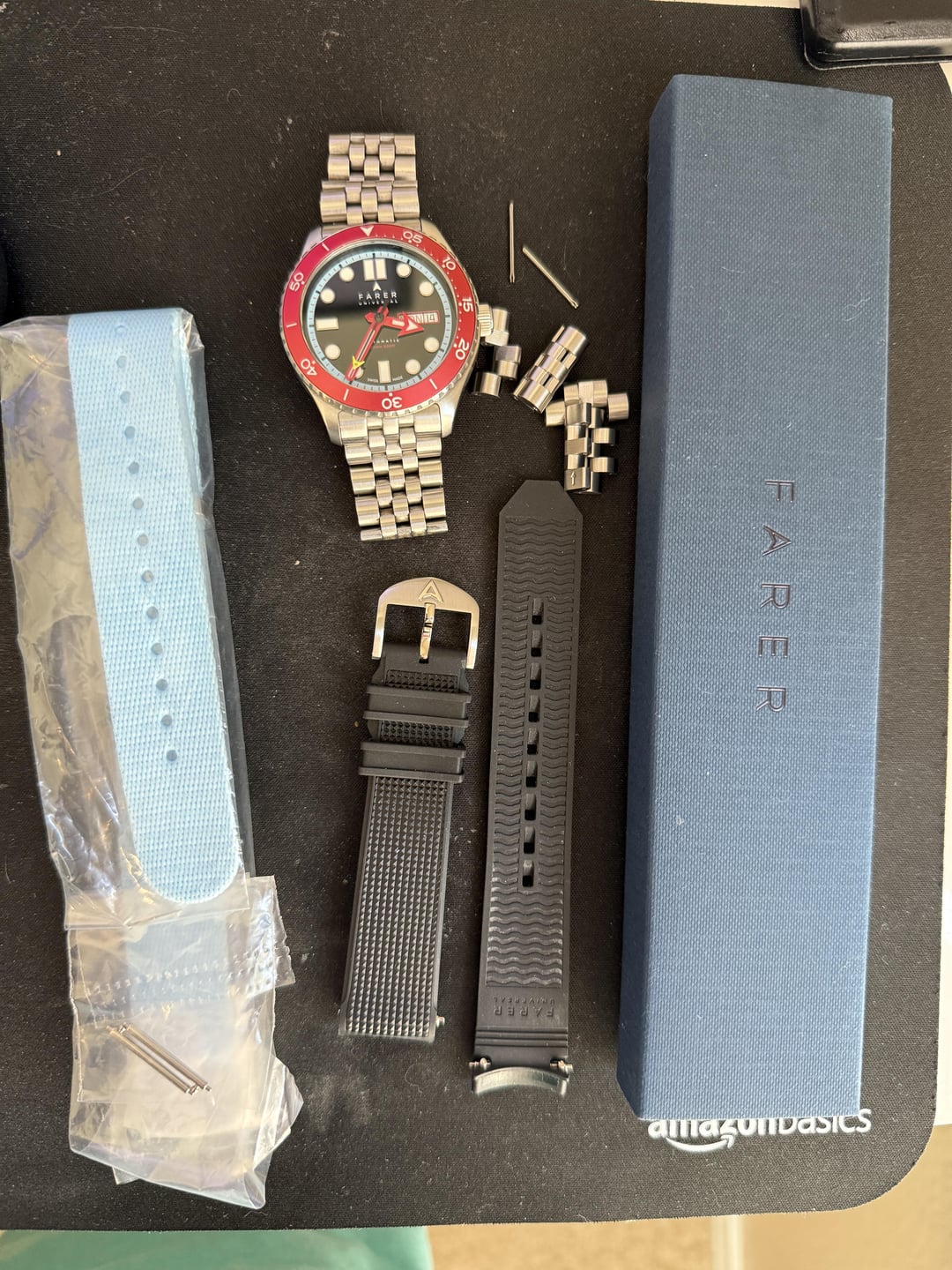 Hey, everyone. I've had this watch since December of 2022. Purchased for myself as Christmas present. It is part of Farer's AquaMatic series. This colorway is no longer available. This is considered a diving/sports watch. Condition: The band shows little to no wear except for normal day-to-day use. I could not locate any discernible scratches in the band upon close inspection. The band could use a steam cleaning/electrostatic bath cleaning at a jeweler. There are NO scratches in the crystal. There is no play/wiggle in the crown, and it screws down nicely as intended. The bezel rotates with a satisfying click as if it were new. Shipping $25 in the continental us. Willing to ship worldwide, would just need to get a shipping quote to your location. This is #44 out of 100. WARRANTY UNTIL 12/2027 THROUGH THE MFG