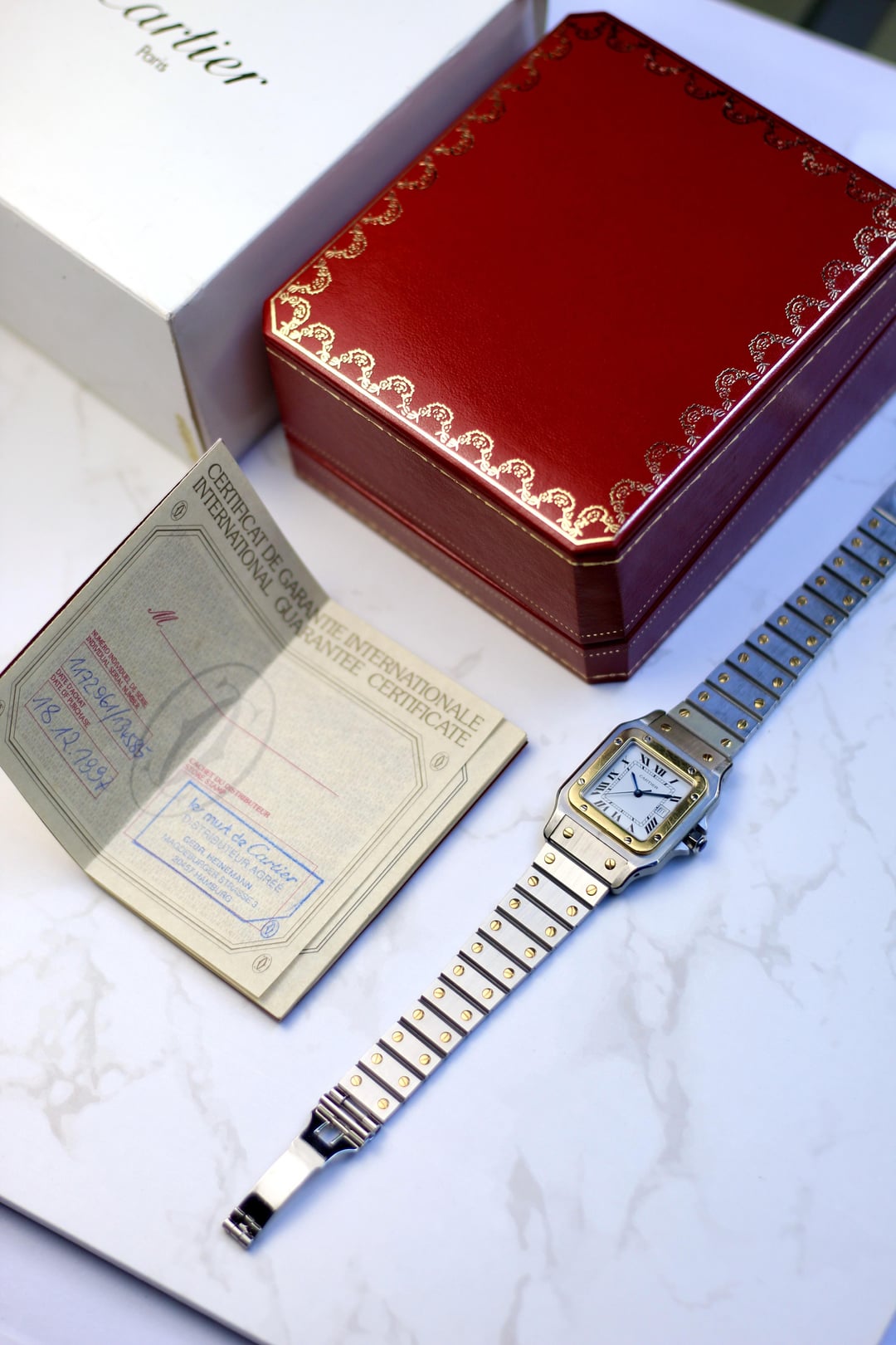 Throughout its history, Cartier has been able to innovate its watches with different shapes and materials and the Santos is probably one of the most recognized watches ever. The Santos offered here is a watch that does not go unnoticed thanks to its lines and combination of gold and steel. The general conditions of this Cartier Santos Carree are fantastic, presenting with minimal signs of use and unpolished, full set with its official dealer guarantee in Germany dated 1997 and bracelet complete of all links, wearing also the biggest wrists. The dial with roman numerals is among the most recognized and desired of Cartier, without any sign present. The automatic movement is perfectly functional and accurate and checked before being put on sale. Price is 5250$ shipping included. The watch is an example of elegance and class and is ready to use for its new owner who will also buy a watch with an excellent maintenance of value. Insured DHL Express worldwide shipping [Timestamp](https://imgur.com/a/F6dBnmV)