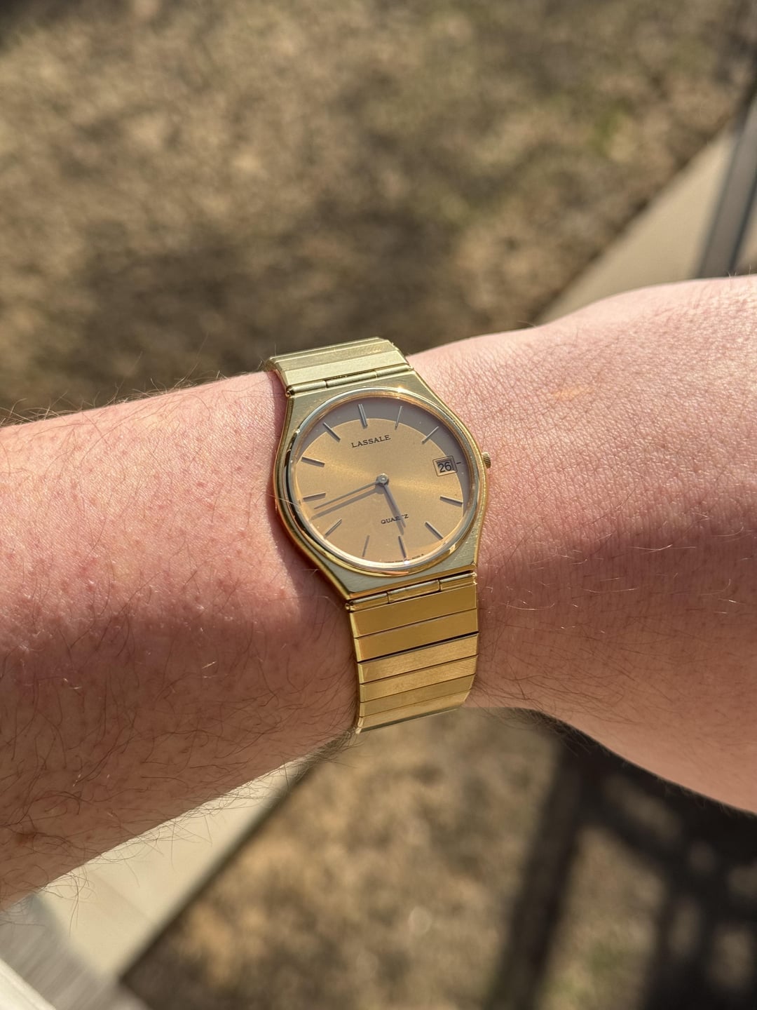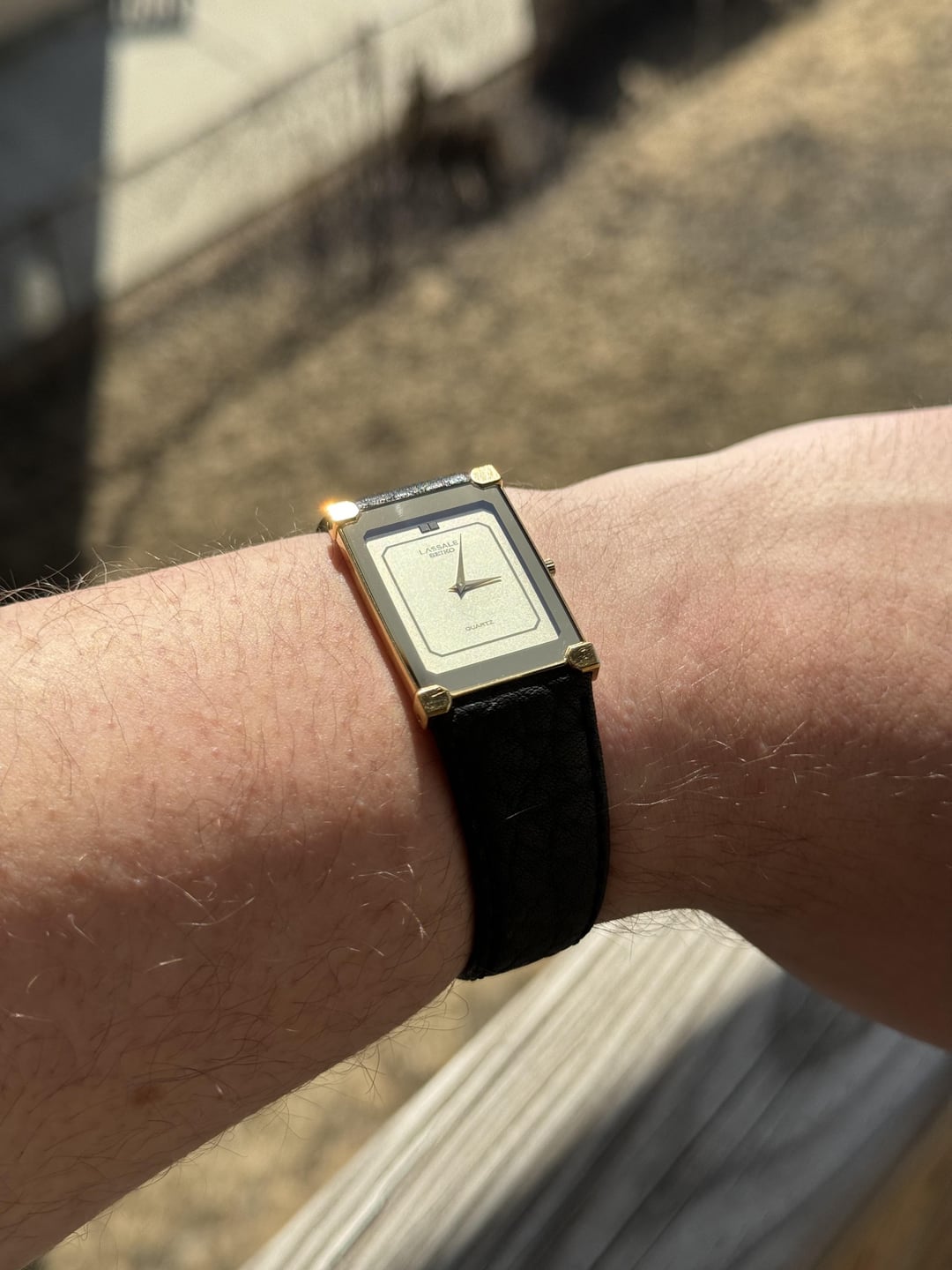 I love Lassales and am constantly collecting them. Will include some history following the details. Details in order of photos. [More Photos](https://imgur.com/a/0qqor9J) --------------- 1. $280 Seiko Lassale - Two-tone, grey dial w/ box and extra links A beautiful two-tone Seiko Lassale with integrated bracelet and "concrete sparkle dial." Keeping time and includes box and two additional links (requires additional pins to install). 27.5mm case 4mm thickness Up to 7" wrist (w/o extra links installed) 2. $185 Seiko Lassale - Two-tone, dark champagne dial Very classy Seiko Lassale in good condition with minimal wear. Genuine crocodile strap and new battery installed. Dial color shifts based on light conditions! See pics. 22mm case 3.5mm thickness 3. $210 Seiko Lassale - Round gold, integrated bracelet Very simple and classy Seiko Lassale with date function. Running properly. Bracelet a little tight on my 7" wrist. Bracelet has been repaired in one spot, but sturdy. 32.5mm case 5mm thickness 4. $200 Seiko Lassale - Gold mirrored bezel This Lassale boasts a mirrored "bezel" showing both as black or gold in different light. Smooth cream colored dial with gold accents, black stone studded crown and hidden lugs. Comes on brand new genuine leather, waterproof Speidel strap. 23mm case 3.5mm thickness 5. $235 Seiko Lassale - Day/date, gold integrated bracelet A very nice looking, gold plated, white dial Seiko Lassale with interesting day hand function and date wheel. New battery, running well. Fits 7" wrist with hidden butterfly clasp on integrated bracelet. 33.5mm case 7.5mm thickness 6. $145 Seiko Tank - Original strap and signed buckle Very nice vintage gold Seiko in popular tank shape. On original strap and Seiko buckle. Running properly. 25mm case 5.5mm thickness 7. $165 Seiko Tank - Silver, new strap Very nice vintage gold Seiko in popular tank shape. On original strap and Seiko buckle. Running properly. 25mm case 5.5mm thickness ---------- Seiko Lassales were manufactured by Seiko for 3 or 4 years in the early 80s. Seiko bought the rights to the Lassale name from Jean Lassale, while Piaget got the thin mechanical movements. Please DM with any questions or bundle offers. No trades. Fast shipping, should be no more than $10.