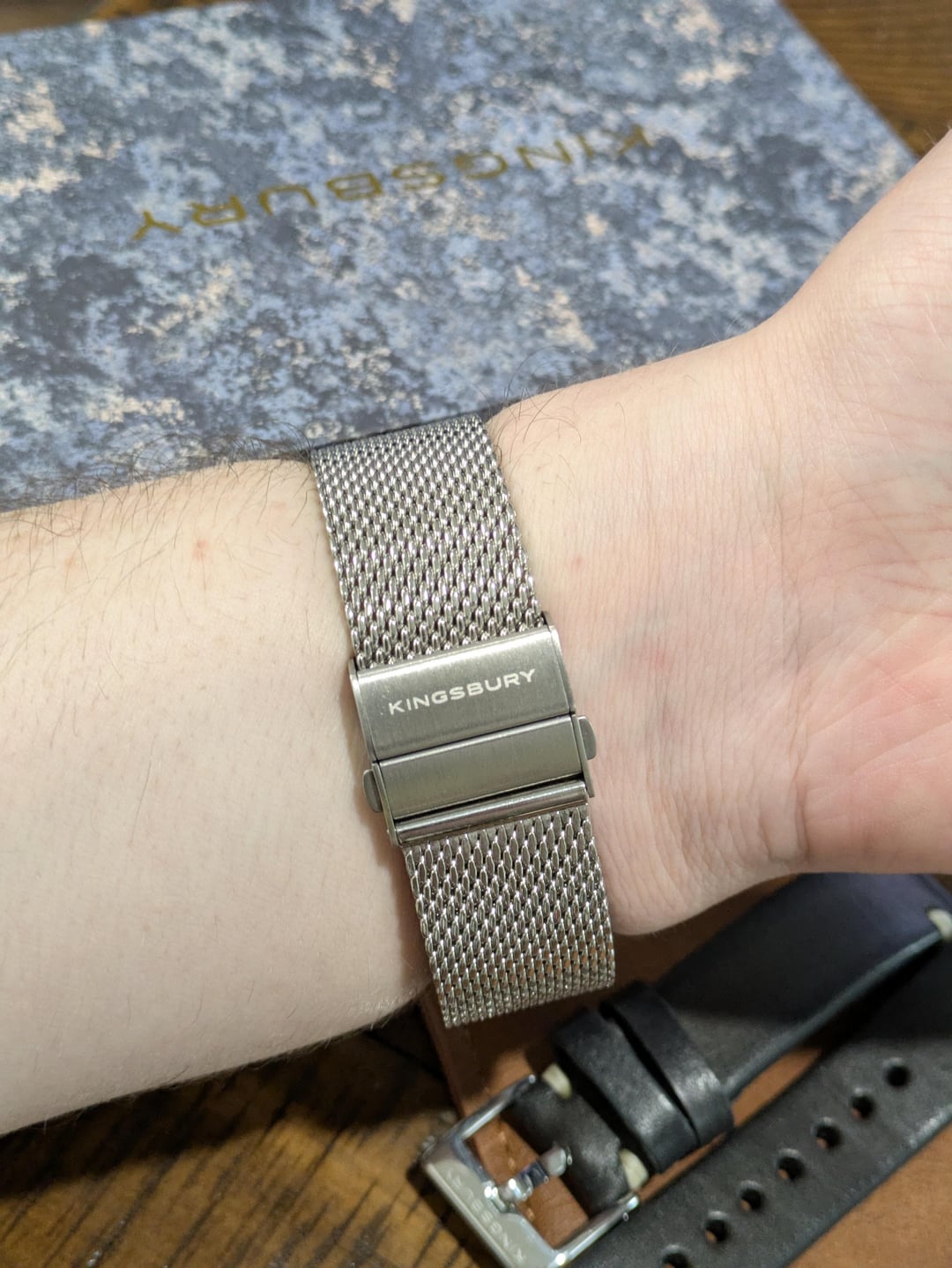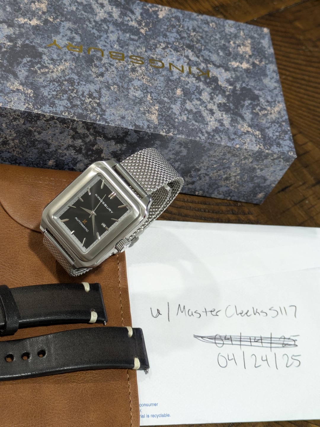 Kingsbury Ambassador Black Sunburst Dial Seiko NH05 Automatic. Original mesh bracelet and aftermarket black genuine leather strap. Full Kit. Like new. 35x47x10mm and wears larger than specs suggest. Asking $160 for now.