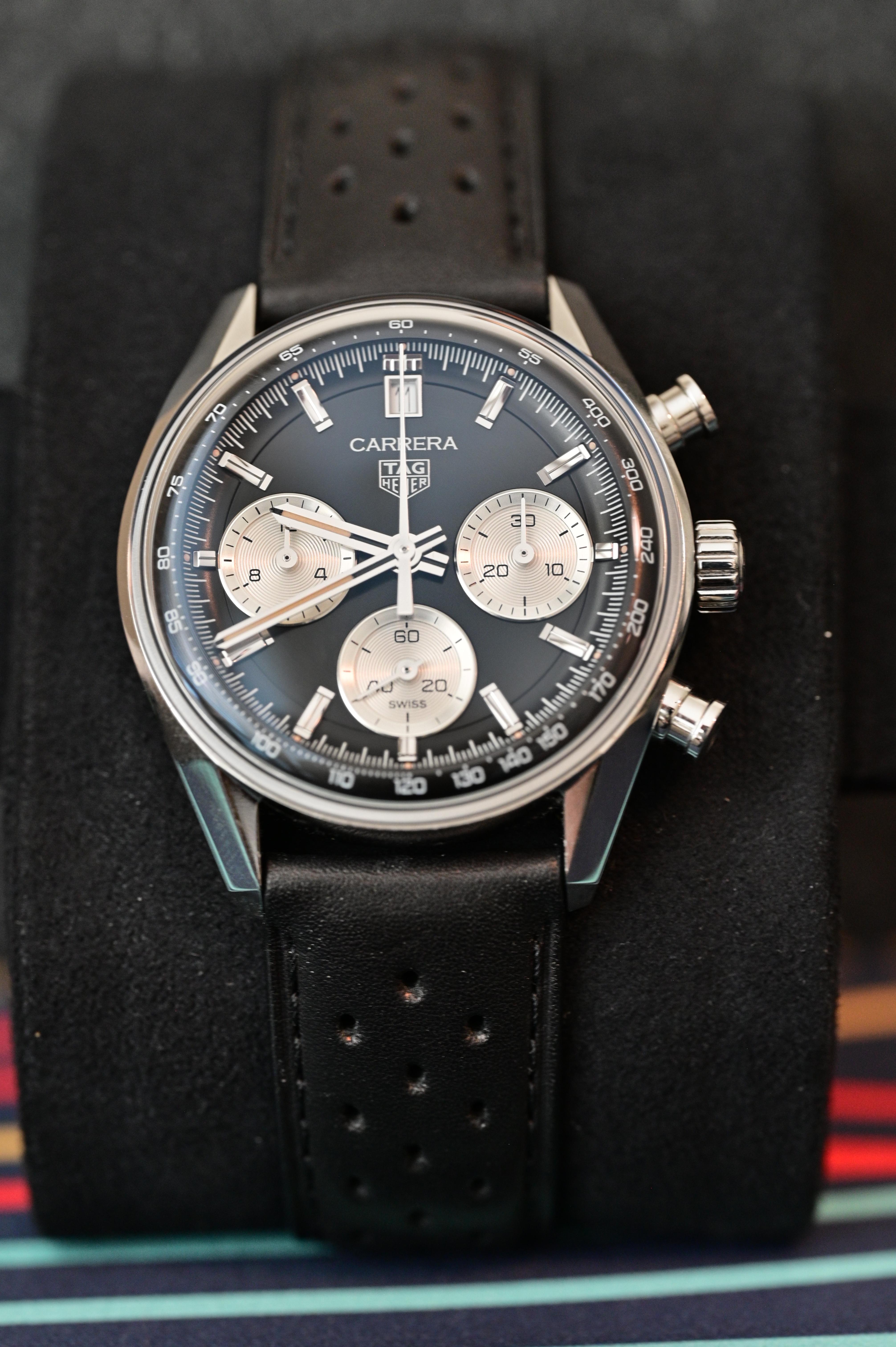 Up for sale today is my Tag Heuer Carrera Glassbox with a reverse panda dial. This watch is close to perfection in my opinion. It has an in-house column wheel vertical clutch chronograph with 80 hrs power reserve and it is the best feature of this watch. Watch is in excellent condition with some scratches on the back of the lugs. I purchased it in July 2024 and it has seen some very light usage. Strap is barely used but the unusual sizing mechanism wears it out more than usual. No trades please. I am selling everything in hopes of just owning one pilot watch and one beater watch More info: [https://www.tagheuer.com/us/en/timepieces/collections/tag-heuer-carrera/39-mm-th20-00/CBS2210.FC6534.html](https://www.tagheuer.com/us/en/timepieces/collections/tag-heuer-carrera/39-mm-th20-00/CBS2210.FC6534.html) Timestamp and Album: [https://imgur.com/a/pZsgJuu](https://imgur.com/a/pZsgJuu) Price: 4500 including shipping within the US Payment: Paypal (Buyer pays the fee) Shipping: Insured USPS/UPS/FEDEX within CONUS I am open to FaceTime calls to show the watch