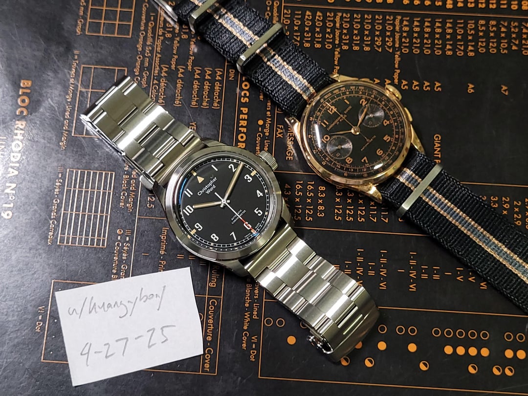 Selling a Christopher Ward C65 Sandhurst (Series 1 Mark 2)! I don’t believe these are available anymore from CW, as they have been replaced by the Series 2. Watch comes with its original box and all papers, and is in great condition. It’s very reminiscent of the field watches made for the RAF in the 1970s, but with some updated design choices. Here are the general specs: * Diameter: 39 mm (excluding crown) * Height: 12.3 mm (including crystal) * Lug width: 20 mm * Movement: automatic Sellita SW 200 * Rate: running incredibly well at +/- 5 s/d * Crystal: sapphire * Crown is screw-down The watch will come with the original leather oak strap by CW (which has seen better days), as well as a strapcode bracelet. Asking **$650** with free US shipping (or best offer), paid with Paypal G+S. I’m mostly letting this go because I’m more of a manual-wind fan. I’ve sold a bunch over at[ r/Pen\_Swap](https://www.reddit.com/r/Pen_Swap/) and ebay (erhu\_80), so you’re in good hands. Let me know if you have any questions :)