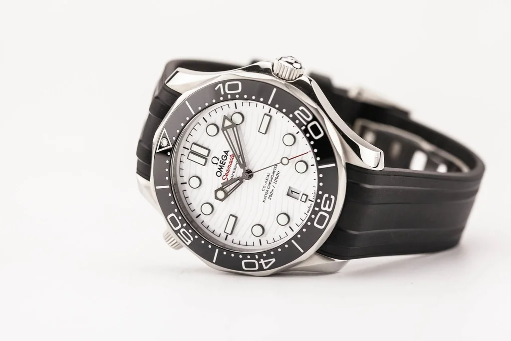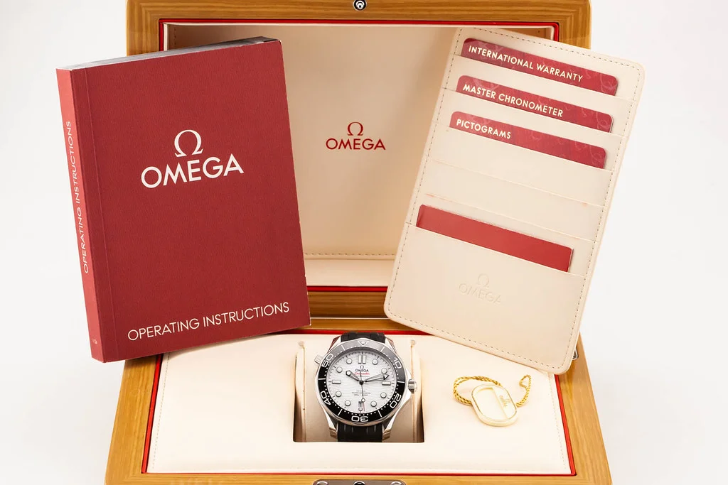 Up for sale is an excellent condition Omega Seamaster 300 White Wave Dial on Rubber Strap, ref # 210.32.42.20.04.001 It comes complete with all boxes, papers, booklets, hang tag and Omega Warranty Card dated July 2020.