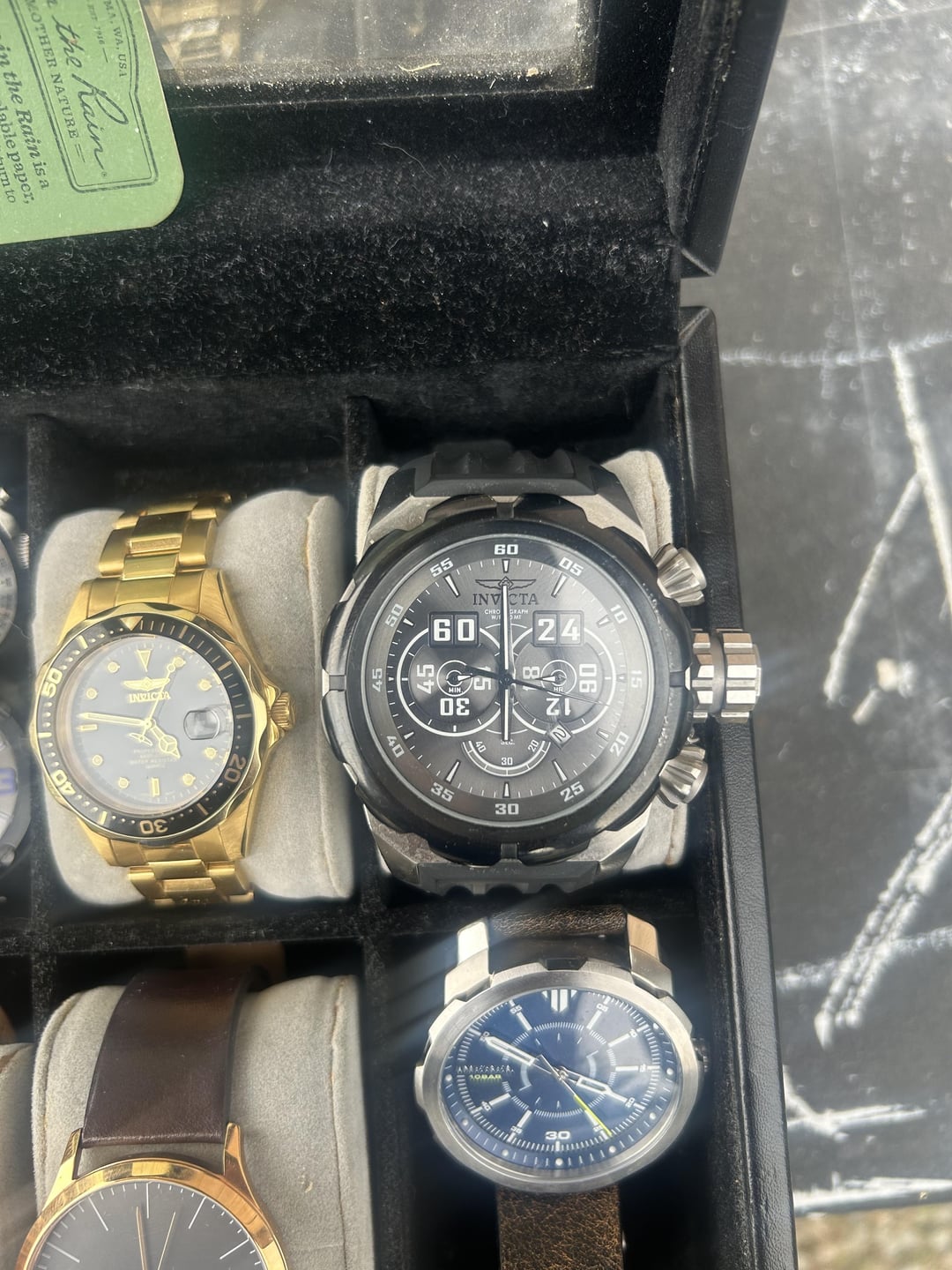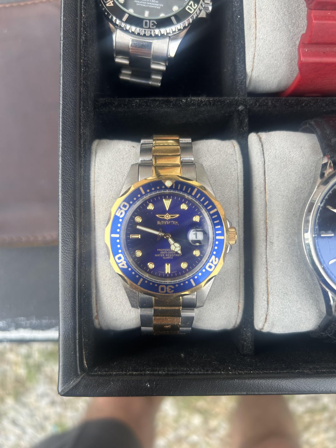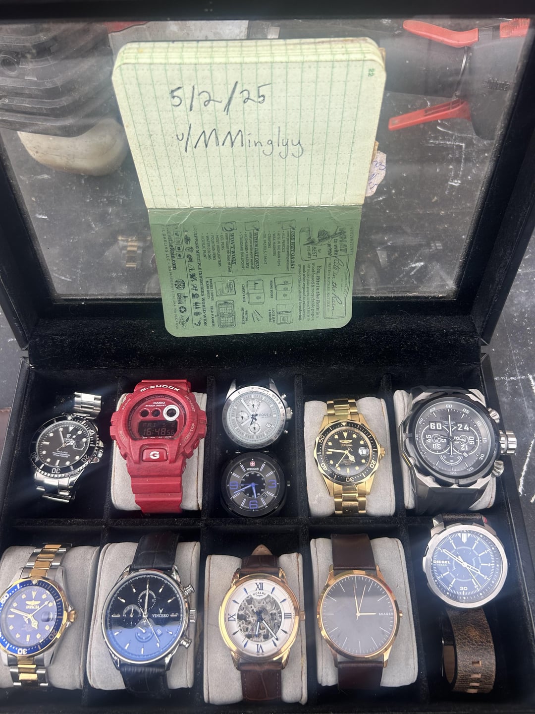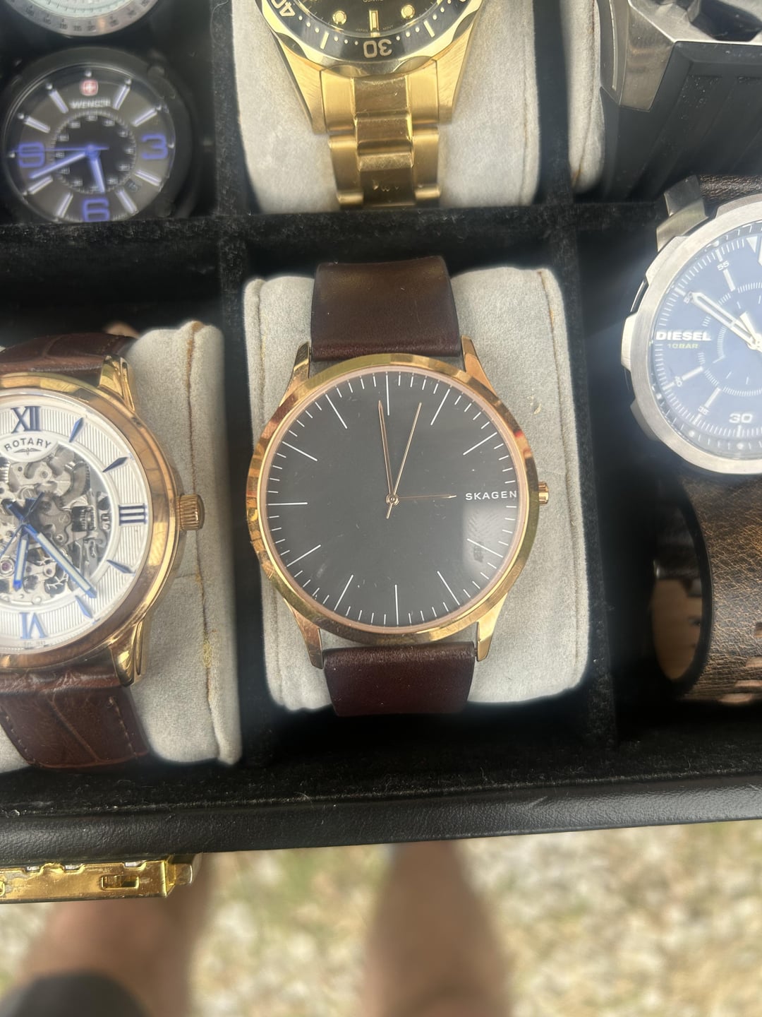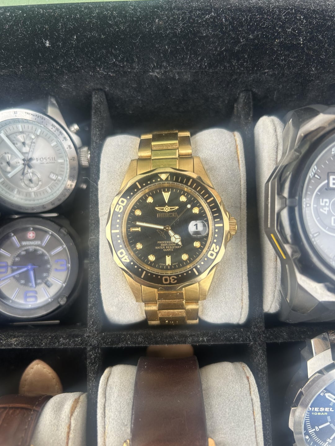 Watch collection prices are obo Invicta professional diver quartz scalloped bezel x2 50$ each or 80& pair semi worn Vincero chronograph-unknown model number. Needs battery semi worn 100$ Rotary GS00653/21 Skelton automatic 100$ Myota movement. Leather strap semi worn Skagen SKW6330 good condition super thin watch 40$ Diesel DZ-1787 251708 Good condition Skagen SKW6330 30$ Invicta Russian Diver 1959 21629 bezel has scratches on crown side otherwise good condition 80$ Fossil CH-2612 251001 No strap 40$ Wenger 1051.12 escort 80$ No strap. Great watch Gshock 3420 90$ Worn condition Tevise submariner clone. 10$ Cheap nh35 movement. Free if you buy another watch Would like to bundle items. Can get the whole collection for 350$ thanks!