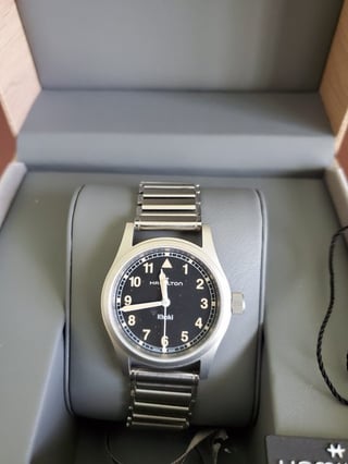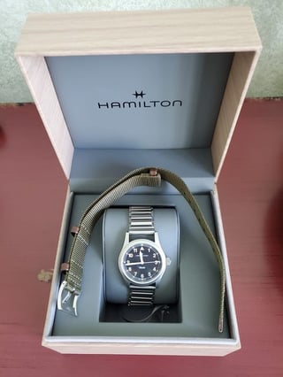 [WTS] Hamilton Khaki Field Quartz 33mm in excellent condition $350. This is the recently released Quartz version in 33mm. In excellent condition with all original packaging. The supplied NATO style strap is unworn and the only strap included.