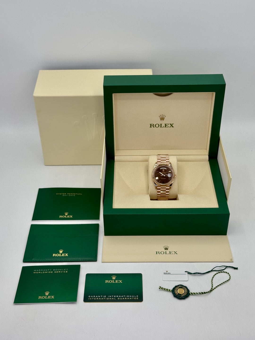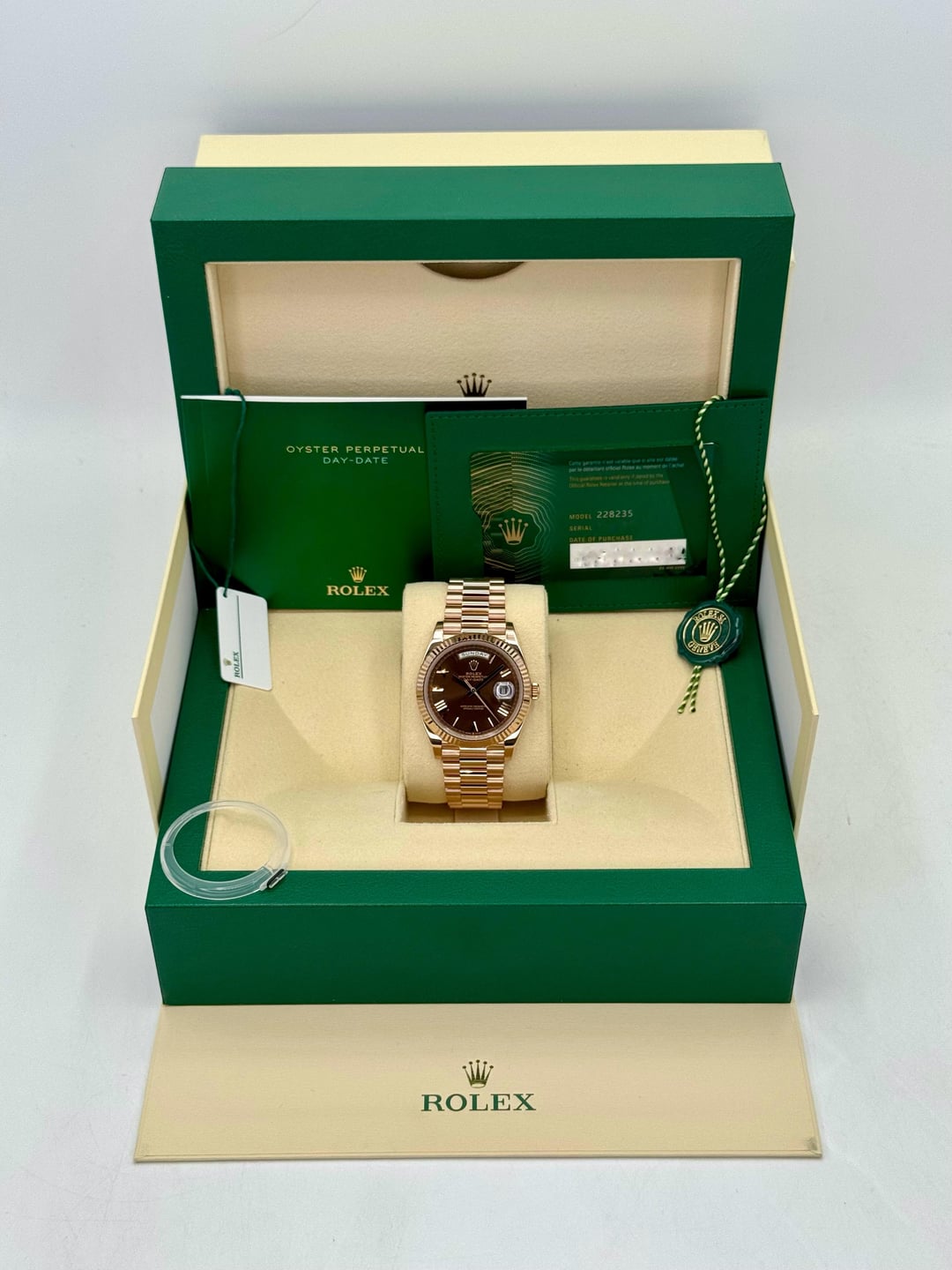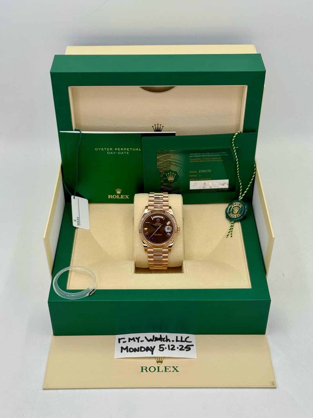 🔵2023 Rolex Day-Date 40mm 228235 Presidential 18kt Everose Gold Chocolate Dial 🔵TRADE or SELL us your luxury watch, all brands considered. Message me details. **Includes the following:** ✔️Original Rolex Double boxed ✔️Box and Papers - Yes ✔️Warranty card dated July 2023 ✔️5 year manufacturer warranty ✔️Manual and Warranty booklets ✔️Green and White Hang Tags included ✔️Bezel Protector ✔️Size: 7.5inch wrist (Full Links) ✔️Material: 18kt Rose Gold ✔️Watch is in excellent overall condition. Please see photos for details. ✔️Trades welcome ✔️Appraisal included Business Name: **My Watch LLC** LOCATION: Oak Park, Michigan ✔️[MyWatchLLC.com](http://mywatchllc.com) for current inventory ✔️Google Business Listing [https://g.co/kgs/Cmd6FPW](https://g.co/kgs/Cmd6FPW) ✔️Business Hours M-F 9-6 ✔️Facetime/Video chat/calls welcome to view the watch interested. ✔️Contact: 248-422-0909 via text or call for quickest response. 🟢TERMS: Visit [MyWatchLLC.Com](http://mywatchllc.com) for payments accepted 🟢REFERENCES/REVIEWS: We are well reviewed on all platforms from google, trust pilot, rolexforums, additionally we have 300+ reference in multiple FaceBook watch groups, reference checks welcome. 🟢SHIPPING: If you are not local, we offer Fully Insured FedEx overnight shipping in the USA for a fee. International shipping available. [https://mywatchllc.com/products/2023-rolex-day-date-40mm-228235-presidential-rose-gold-chocolate-dial-1](https://mywatchllc.com/products/2023-rolex-day-date-40mm-228235-presidential-rose-gold-chocolate-dial-1)
