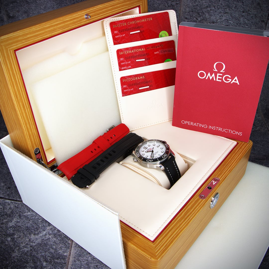 OMG Seamaster Diver 300M  210.30.42.20.04.001 Case: 42mm Condition: Very good condition, showing little to no signs of wear. It has been meticulously kept and worn with care, reflecting the pride of its previous owner. Accessories: Original OMG Presentation Box, International Warranty Card (dated 2022), Master Chronometer Card, Pictogram Card, Operating Instructions Booklet, Original OMG Black Rubber Strap, Two (2) Additional non-Omega Straps (One vibrant red rubber strap and One stylish black cloth strap with white stitching) Immerse yourself in the world of horological excellence with this stunning **OMG Seamaster Diver Professional 300M**, reference **210.30.42.20.04.001**. A true icon of dive watch legacy, this timepiece seamlessly blends OMG’s rich maritime heritage with cutting-edge technology and breathtaking design. The captivating **polar white ceramic \[ZrO2\] dial**, laser-engraved with the signature Seamaster wave pattern, evokes the spirit of oceanic adventure and offers unparalleled legibility. $4️⃣5️⃣0️⃣0️⃣ + 🏷️ MSRP: \~5.9k Shipping available to anywhere in CONUS. Shop with confidence, many references available and authenticity guaranteed! NY residents subject to sales tax without resale certificate IG: royaltimepiecesltd Timestamp: [https://imgur.com/PFUlGTY](https://imgur.com/PFUlGTY)