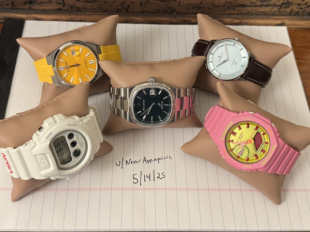 OK Reddit I’m looking to sell a few watches to thin the herd. All watch prices include CONUS shipping. I prefer PayPal F&F / Zelle/ Venmo. No trades, as I am looking to reduce my collection and lit a little money aside for a future purchase. - Citizen NJ0150 “Tsuyosa” 40mm - Yellow. [sold]. I have it on a yellow rubber strap, but I have the bracelet (sized for 7.5” / 19cm wrist). https://www.citizenwatch.com/us/en/product/NJ0150-56Z.html - Revelot Universal 36mm - Grey Sky. [$75]. A little Polerouter homage. https://www.revelot.com/collections/universal/products/universal-36mm-grey-sky-steel - Casio G Shock DW-6900-NASA-23-7 Limited Edition by White. [pending sale]. https://www.casio.com/us/watches/gshock/product.DW-6900NASA23-7/ - Casio G Shock GMA-S2100-BS-4A - Pink. [$75]. https://www.casio.com/us/watches/gshock/product.GMA-S2100BS-4A/ - Bulova Super Seville - Green. [$350]. Precisionist movement. https://www.bulova.com/us/en/product/96B439.html