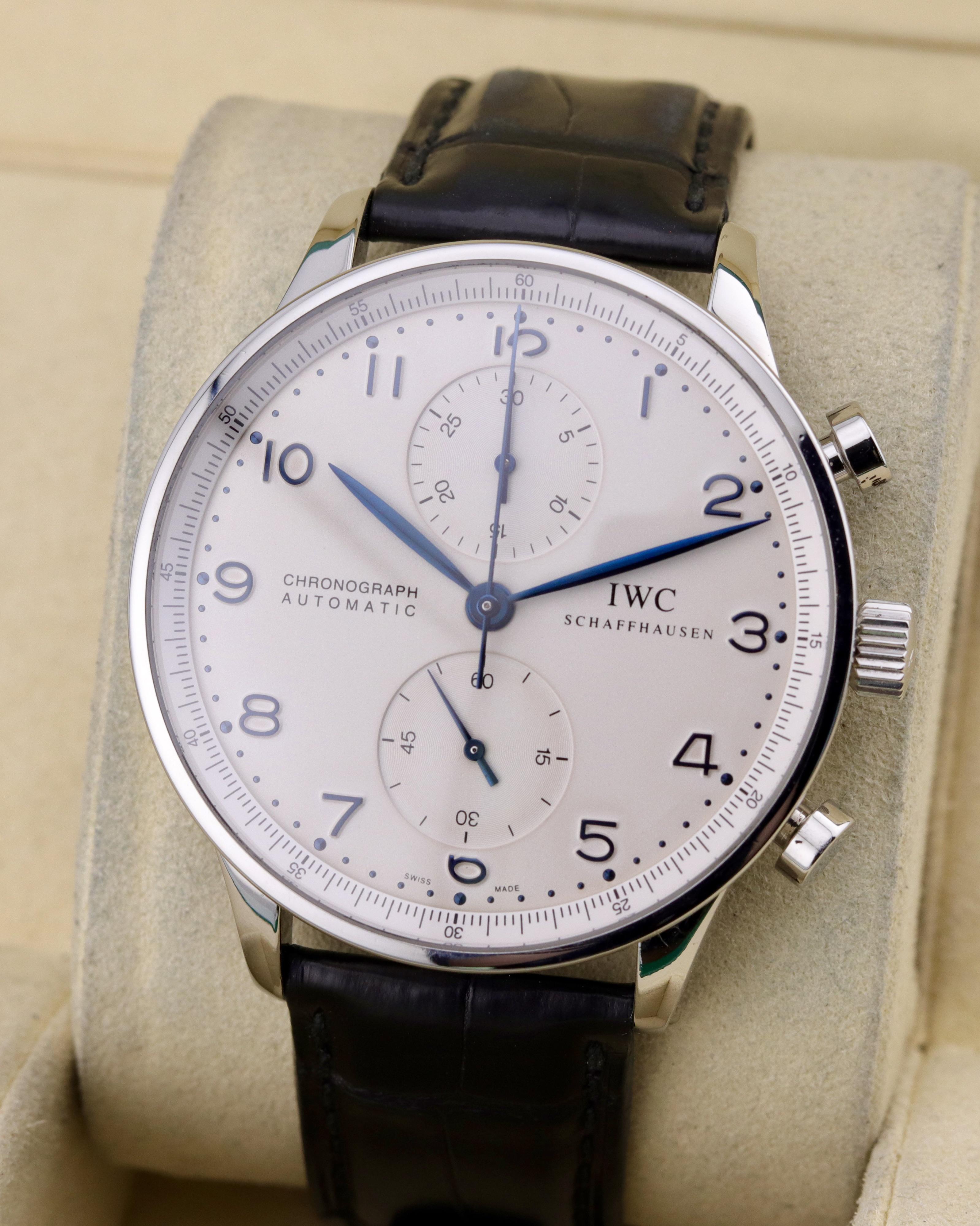 Up for sale is an **IWC Portuguese Chronograph IW371446** Size: 40.9mm Location: U.S. / Georgia Condition: Great condition overall. The sapphire crystal is clean with no scratches or chips. The white dial with blue steel hands and Arabic numerals is in perfect condition. The case shows light wear consistent with careful use, with no deep marks. Leather strap is worn but still very wearable. Automatic movement keeping good time with no issues. Comes with warranty card and manual, no box. [Pictures](https://www.dropbox.com/scl/fo/gqmzb2xe0pug3fyc20gwq/AI41GWTa2MLRpw5y8qJdOzg?rlkey=g4bphcorackyktqpwfonlv6nk&st=tuxuf69a&dl=0) [Timestamp](https://www.dropbox.com/scl/fi/deb9cbdhupxgoosw3ad2f/Photo-May-14-2025-3-38-47-PM.jpg?rlkey=5auxlw3oz5852rw3c99sys3y2&st=1vszw2l1&dl=0) **Price: $3,900** payment methods accepted are Zelle, Paypal G&S+3.5%(for qualified buyers), and Bank Wire. I will also accept cryptocurrency and silver/gold bullion. I ship within 24hrs of receiving payment. I’m willing to ship almost anywhere with buyer paying shipping Any watch offered can be polished and serviced prior to shipping for an additional cost. Lead time varies. READ BEFORE SENDING TRADE OFFERS: If you send me a trade offer and it has no price or “trade value” it will be ignored. No trades on or for watches under $1k. GA residents may be required to pay state sales tax IG: thewatchtradingpost Please feel free to reach out to me with any questions or concerns at [email protected] or message me privately on here and I’ll respond ASAP. I’m also open to phone calls and FaceTimes during the day. There has been ongoing issues with Reddit chat/messages recently. Email is the fastest way to get into contact with me.