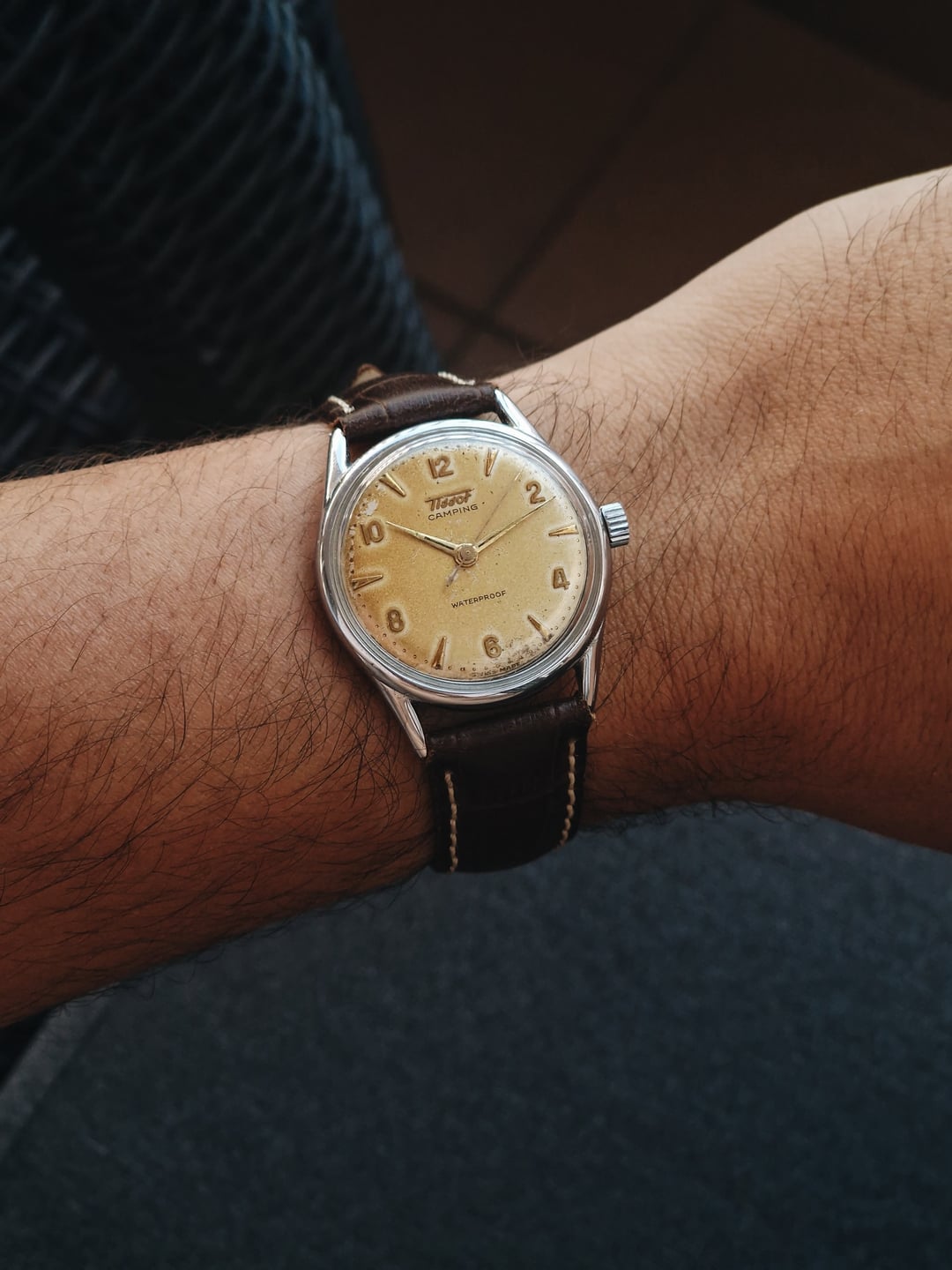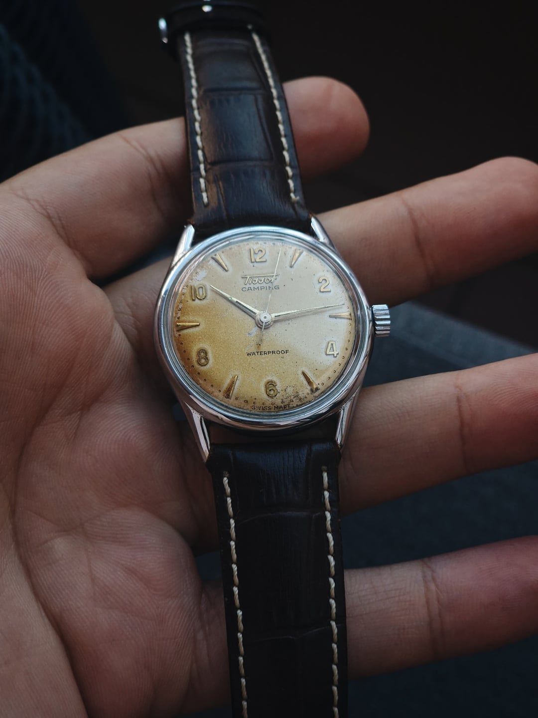 For sale is a 1957 Tissot Camping in excellent condition. Launched in the 1950s, the Camping collection was known for its waterproof cases and sturdy in-house movements. The watch features a manual wind Tissot 27B-21 movement with 16 jewels and a power reserve of 44 hours. **Condition:** Very good. The dial has a ton of charm and patina. Please see the pictures for a better description. **Case Size:** 32.5 x 39.3mm stainless case with a thickness of 9.5mm and a lug width of 17mm. **Crystal:** Acrylic **Movement:** Tissot 27B-21, manual wind, 16 jewels, power reserve of 44 hours. I don’t know its service history, but everything is working as it should. **Price:** Asking $215. Please add $20 for worldwide shipping. Payment methods include Wise, ACH transfer, Revolut, Bitcoin (On-Chain or Lightning), or PayPal G&S for buyers with solid references. Add +6% for currency conversion fees on the latter. I’m located in Portugal, but worldwide shipping isn’t an issue. Established seller with over 220 transactions – buy with confidence! Make sure to follow me on Instagram (@daily.worn) to check out the newest additions. [Pictures](https://imgur.com/a/HSHCTAT) [Timestamp](https://imgur.com/a/i6Rlzbt)