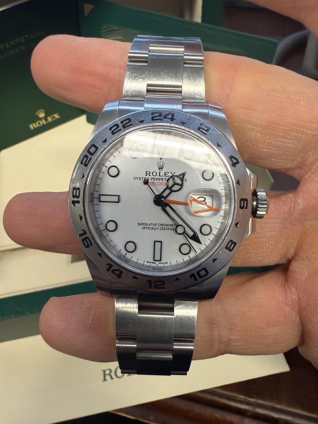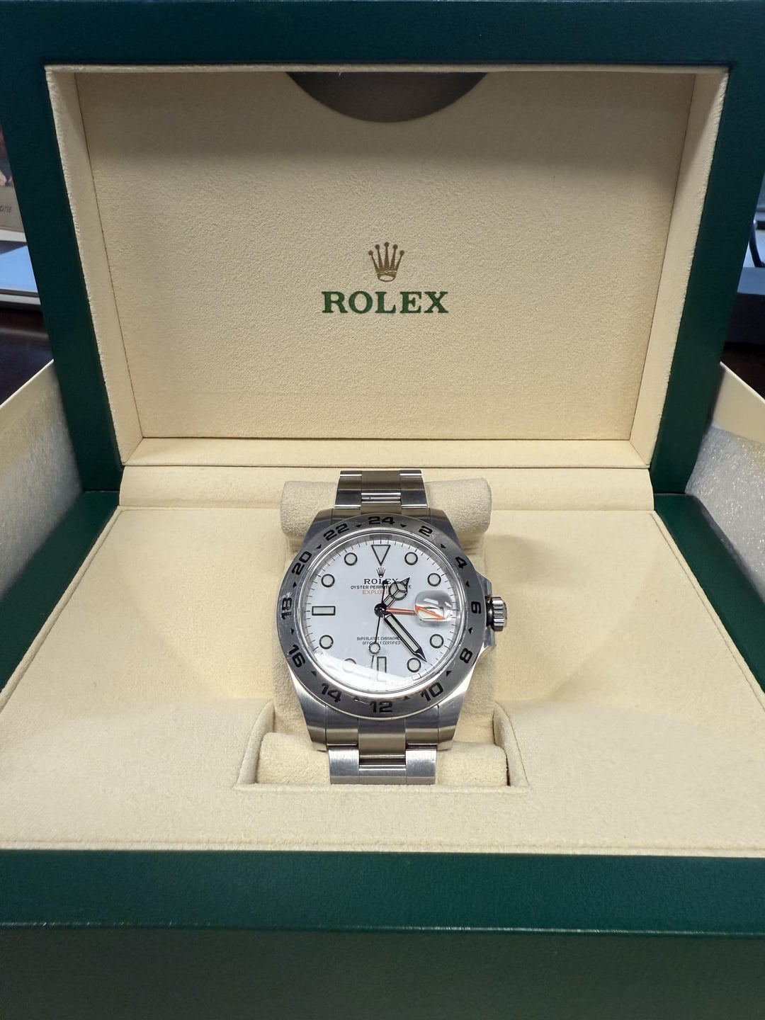 Step into adventure with this stunning Rolex Explorer II Polar, reference 216570, featuring the iconic white “Polar” dial contrasted by bold black hour markers and the signature orange GMT hand. This 2020 model comes as a complete full set, including: • Original inner and outer Rolex boxes • Warranty card dated 8/31/2020 • Explorer II manual and booklet • Hang tags • White serialized tag The 42mm stainless steel case houses Rolex’s robust Caliber 3187 movement, offering dual time zone functionality and legendary durability — the perfect companion for both travel and everyday wear. This piece is in excellent condition and ready for immediate wrist time or safe storage in any serious collection. Offered at: $10,800 DM @SperbsTimepieces or contact directly to make it yours.