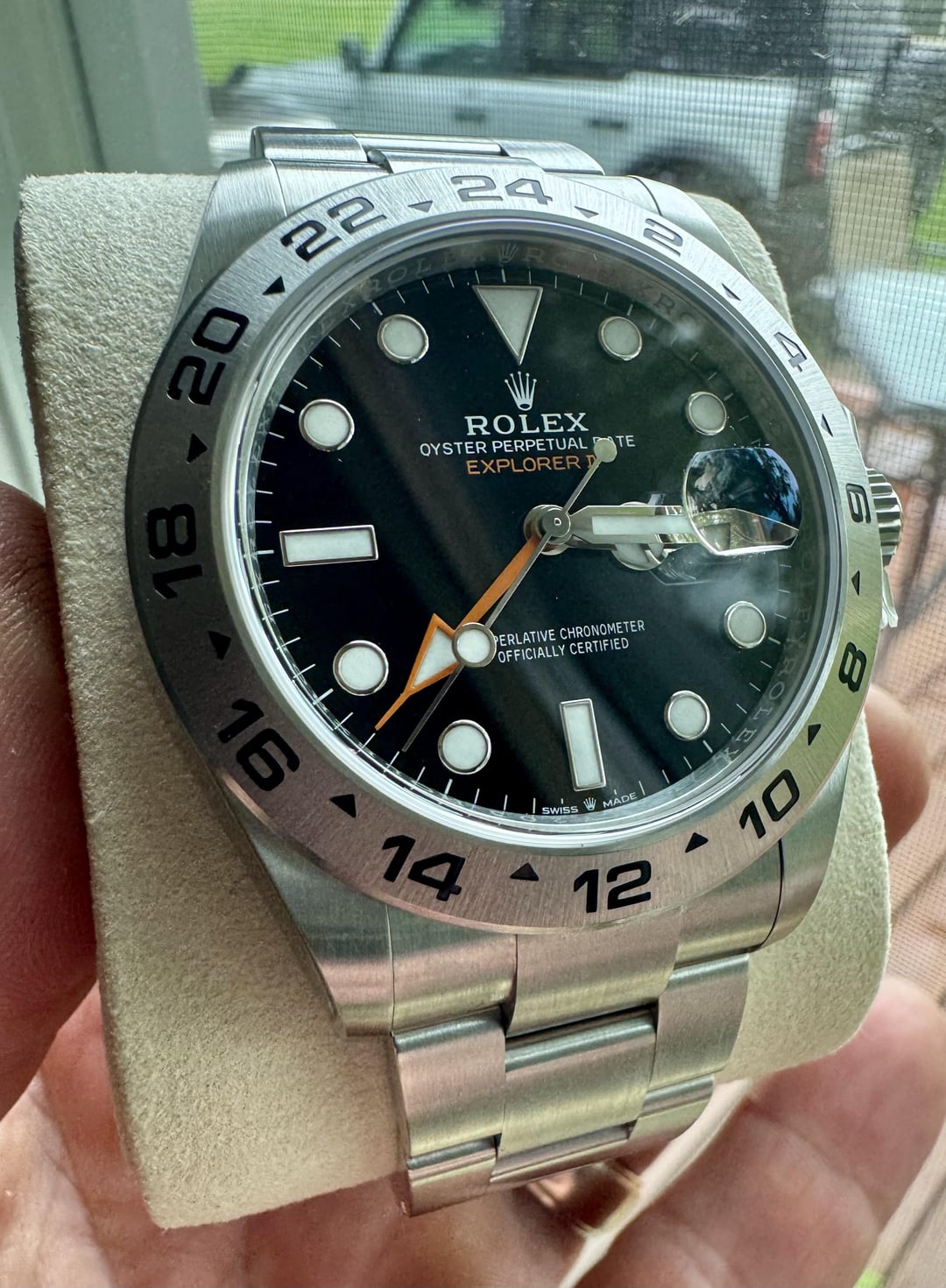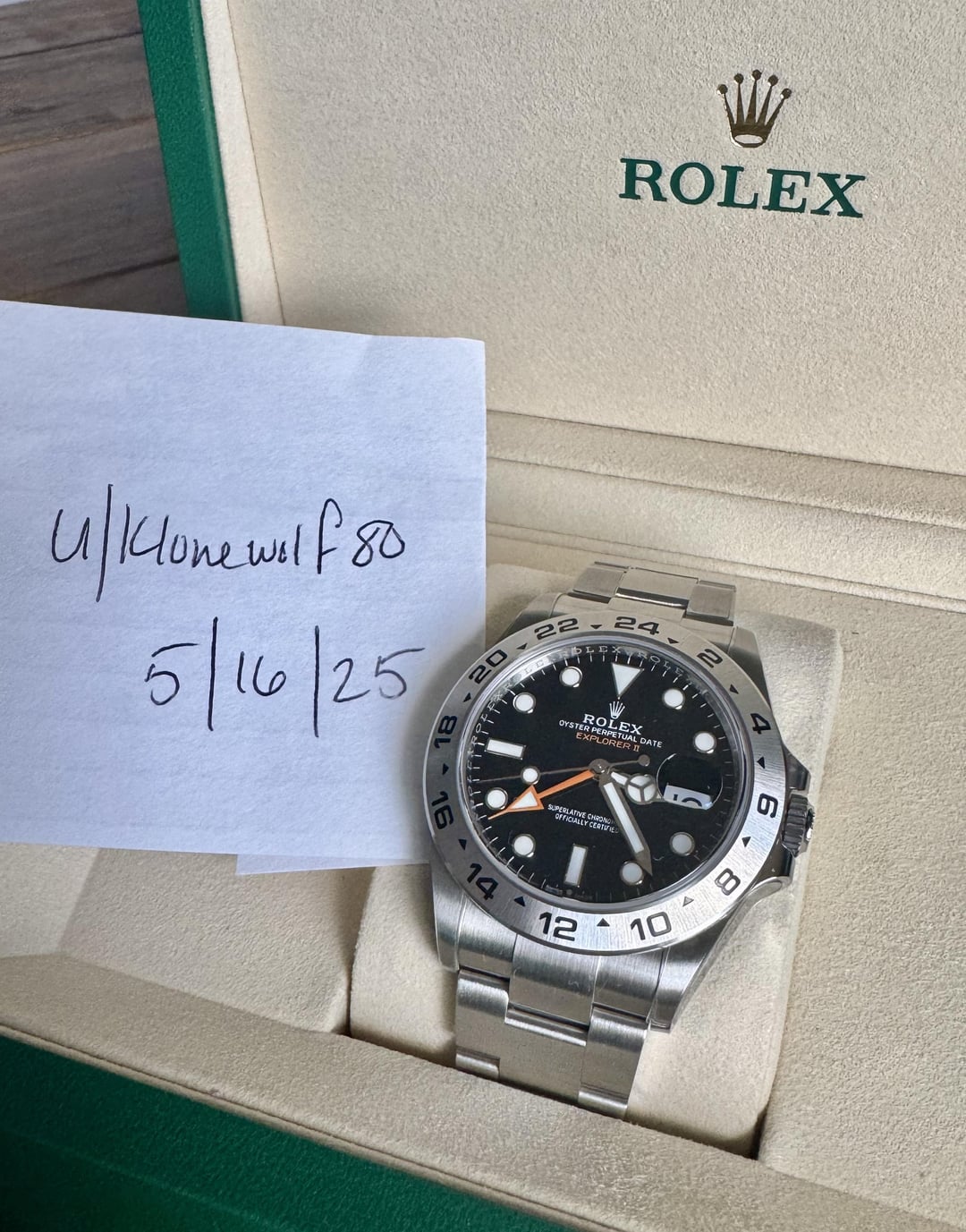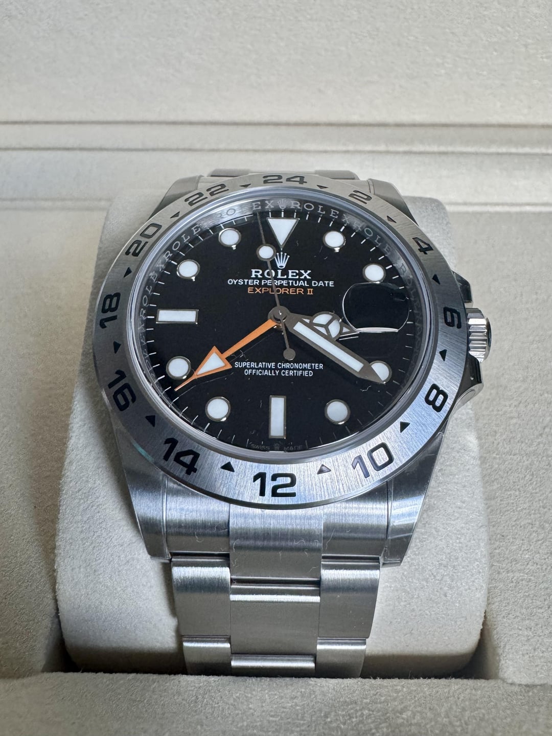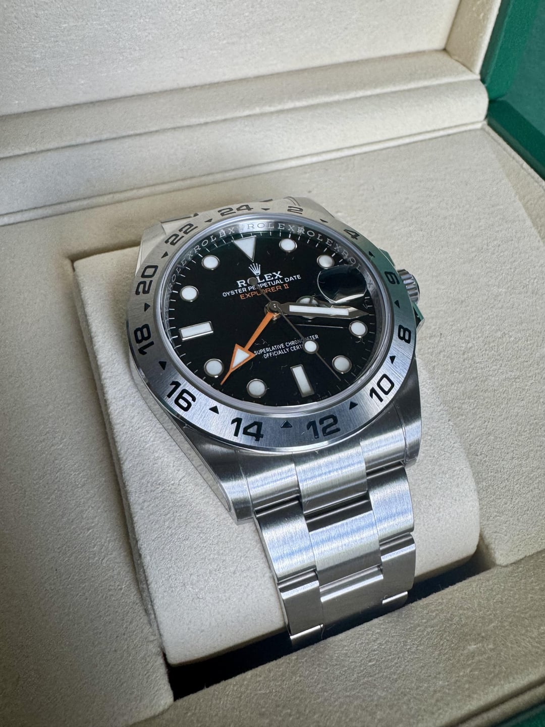 Selling a Rolex Explorer II 226570. This is a complete set with both tags, booklet, warranty 4/2025, both boxes, and full links. Condition is like new. Watch is weeks old. HD plastics were installed on case, bracelet, and clasp upon receiving the watch. Asking $9875 plus label. Payments by Zelle, Venmo, Wire, PP FF. G/S for established members add 4% Please reach out with any questions.