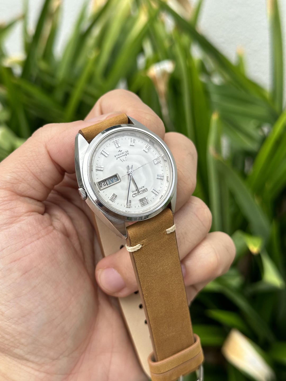 Up for sale is my Seiko LM Special 5206-6020 rare beautiful white opal dial, with 28800bph 25 Jewels and was made in December 1970. This LM special movement is a good improvement from the 5606 which has a crappy plastic day/date wheel and 21600bph. The particular movement 5206 is one of the last high-end automatic watch movement from Daini Seikosha before Quarzt revolution and later recantation by Seiko as 4S movement in 1992. More history: https://www.watch-wiki.net/index.php?title=Seiko_5200 Specifications: • Movement: 5206 • Case: about 36mm original unpolished, lug width: 18mm • Come with brand new tan leather strap • Rare white opal dial • Original crystal free from scratch • Quick set daydate works fine, while quicksetting the date it also winding up the movement. Example of movement here: https://youtu.be/lHnUxI0fgnE • Instant Daydate changing at midnight • Serviced in January 2024 • Performance: +/-15s per day Timestamp: https://photos.google.com/share/AF1QipPgZZsK6Hnmk6QCBYyiXvtmoSwvttZ_WDKSlAV_7xB3CLB1LvpEr7vPUwX2xdt8sQ?key=UDAtMXZyUVBtM3FGdng2MTJqd1k1ZkRJdjFndFZB Album: https://photos.google.com/share/AF1QipNyW1QB6m3idc2aq-awN6CYUNV-eREeXHiYJlnwHEItZgeUswWmY440XiCQYfAzyA?key=X3pHTXVrNm5MUVRVQ0M5T1RlNFg0d1A4TmJqNDZ3 I’ve been selling watches in this sub years now, please check my transaction flair. I’m asking for USD 399 Net via PayPal F&F or direct wire including DHL Express Worldwide shipping with tracking number. Thanks! DHL Express -> US conus, North America, Europe, Australia: 3-5 days DHL Express -> UAE Dubai: 1-2 days