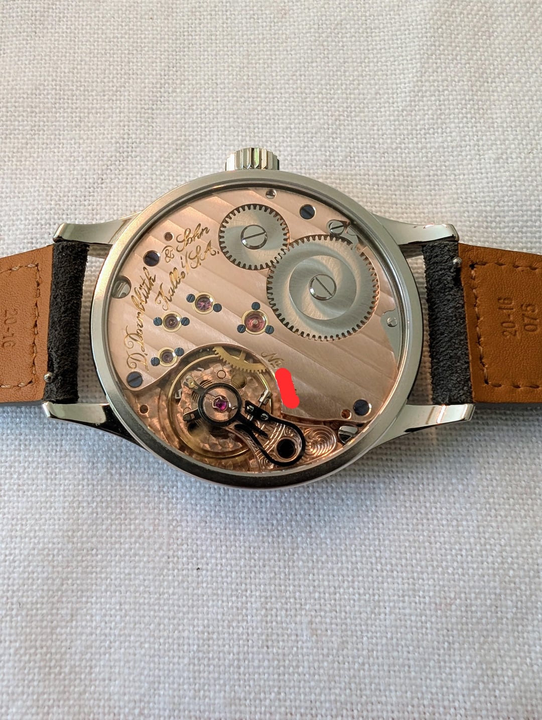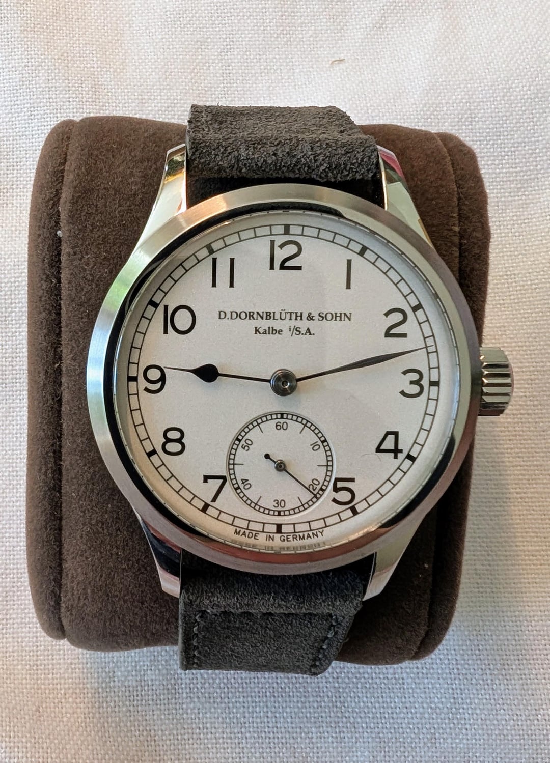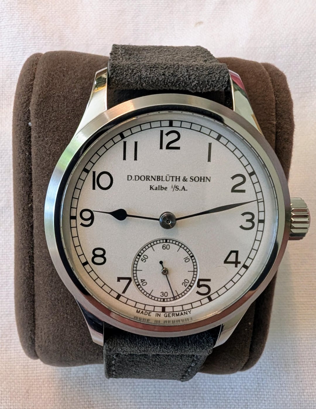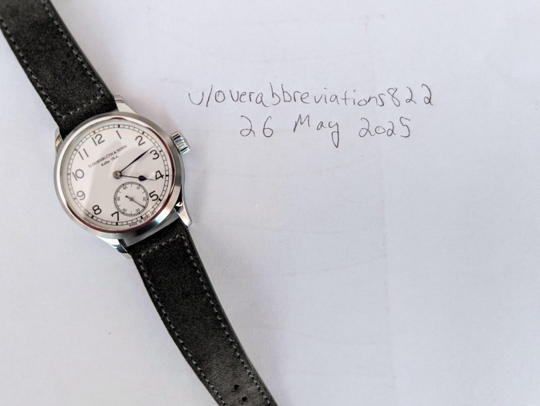 For sale is my Dornblüth & Sohn Calibre 99.1-M - brand new with 2025 papers (two year manufacturer warranty). Other than putting it on a suede strap, it has never been worn and is brand new with box and papers. **Price: $7499** including insured U.S. (via USPS) or EU (via DHL) shipping. I am in the U.S. military but stationed in Europe, so I can ship within the U.S. or EU with no duties/import fees. I waited over a year for this, and literally the week I received it, I got "the call" from my AD, and I need to sell to free up funds. Otherwise this would not be leaving my collection. Dornblueth Calibre 99.1-M manual winding watch - 40 mm • Watch diameter (mm): 40.0 • Watch height (mm): 10.0 • Lug to lug (mm): 49.5 • Case finish: Mixed • Case metal: Stainless steel • Case back: Transparent Dial color: Silver/White • Front crystal: Sapphire • Movement: Manual mechanical Photos: [https://imgur.com/a/qlEe5OI](https://imgur.com/a/qlEe5OI) Timestamp: [https://imgur.com/a/gSnz89O](https://imgur.com/a/gSnz89O) Dornblueth watches are made according to Dirk's time, one by one. The total production is often just eight pieces in one month, sometimes a bit more, sometimes a bit less. Dirk cuts the metal, designs the movements, and creates virtually every piece of the watch himself, in his small workshop converted from a garage. Each watch takes time, a lot of time, and for this reason, no two watches are exactly the same. The Dornblueth & Sohn Calibre 99.1-M (Medium) is a modification of Dirk's Calibre 99.1.  It features the same design, but packed into an very wearable 40 mm case. Everything is here - 3/4 plate, beveled edges, screw balance wheel, swan neck regulation, engraved balance cock, screwed gold chatons, and blued screws (by flame of course, including the slots). And now the extras. The name "D. Dornblueth & Sohn, Kalbe i./S.A." is hand engraved and not machine engraved, a virtually rarity on any watch. And all of the decoration (Cotes de Geneve and the sunray finish on the crown wheel and ratchet) are all done in-house, by hand.  You'll notice that the movement is rose gold in appearance - this process itself is elaborate. After cutting and polishing the plate, Dirk treats the surface to turn the metal a copper color. After all of the drilling and milling operations are complete, the movement itself is treated with rose gold to enhance the deep color. The dial is coated in silver, and is matte finished with black hand painted Arabic numerals and "railroad track" markings around both the dial and subdial. Blued steel hands. Thanks for looking, and please reach out with any questions! (Edited to add links to photos and timestamp.)
