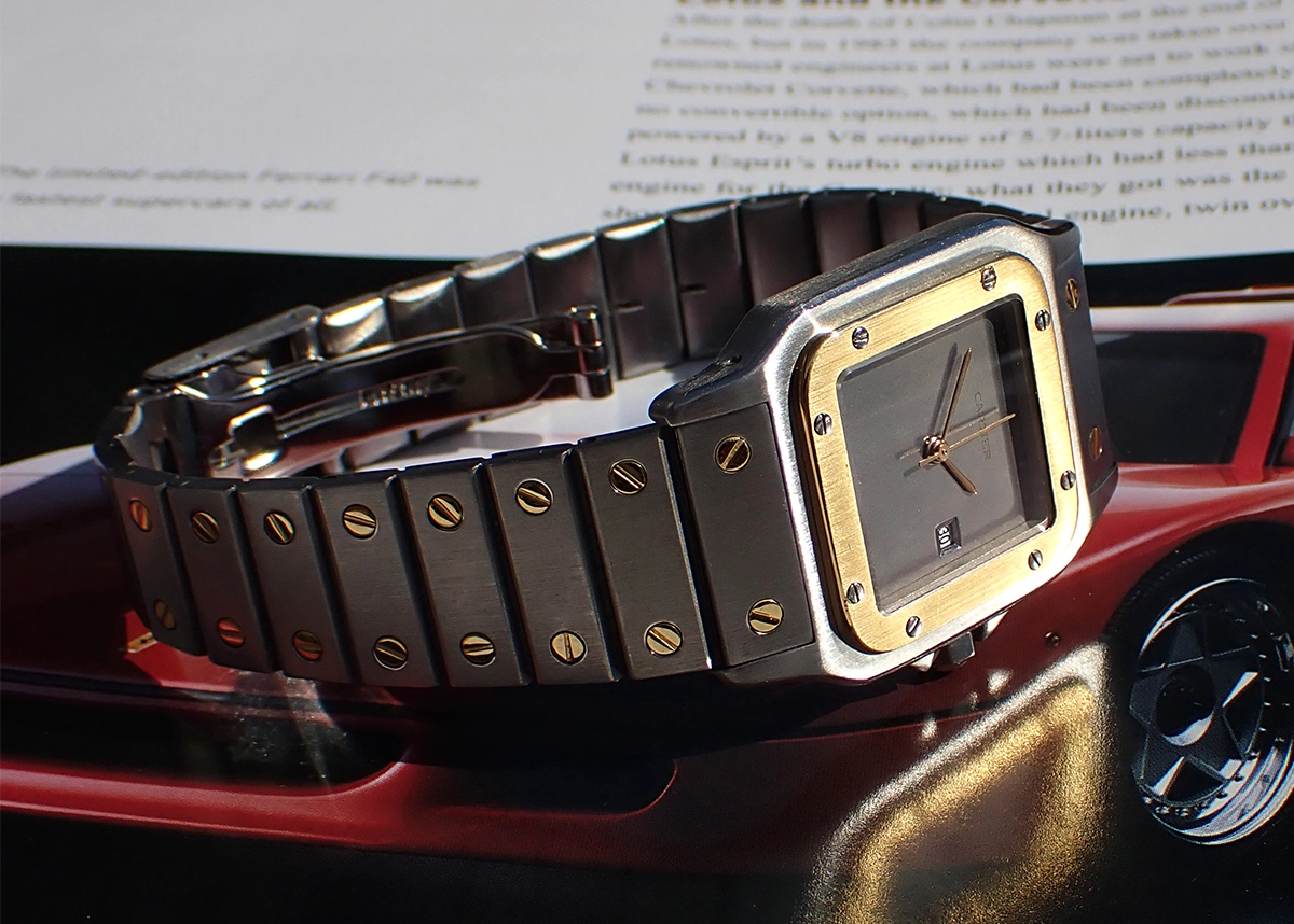 BRACELET: This great Carrée comes on its original semi-integrated first generation bracelet with trademark gold screws set into rectangular satined steel links and Cartier-signed logo clasp. This bracelet is both super tight, as is the snap-in clasp, and super long, presently fitting a 7.5” wrist at what I feel must be its full original length. You can tell it’s first generation by the wide clasp closure and the push pin released, slide-in links. Cosmetically, this beautifully crafted bracelet is in Excellent+ unpolished condition with only minor marks from wear.