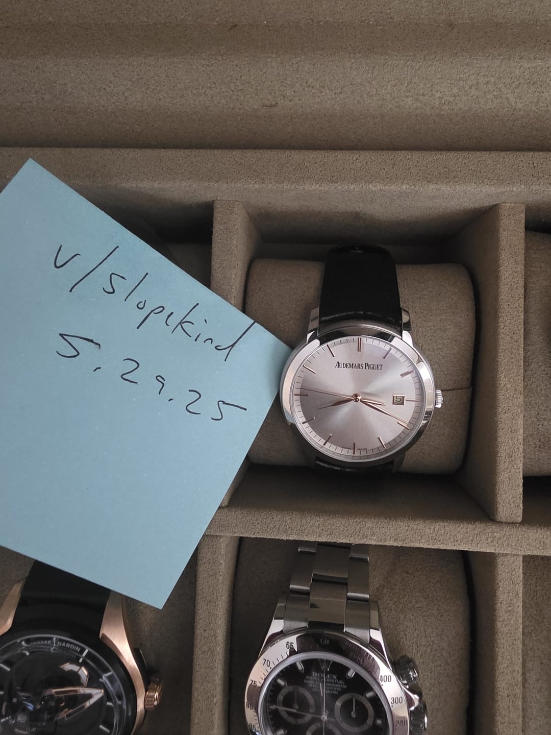 AP Jules Collection Ref:15170BC This watch is in good condition overall with light wear throughout. It comes complete with box and the papers. (Papers have second hand dealer sticker overtop the original paperwork)The case is white gold and 39mm. The strap shows slight wear. The watch dates roughly to 2010. Watch was just serviced by my in-house watchmaker on 3/26/2025 Timestamp & Pics = [https://imgur.com/a/JUSzjfk](https://imgur.com/a/JUSzjfk) Price = **$13,499** shipped fully insured IG = watchfornia Cheers, Adam